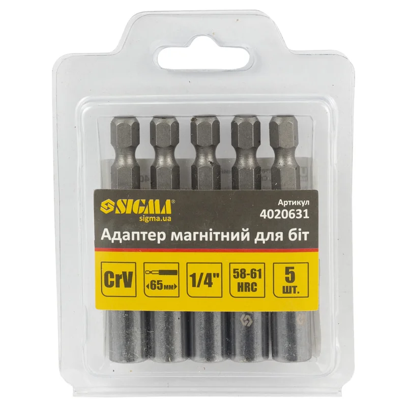 Адаптер магнітний для біт ¼" 5шт CrV (блістер) SIGMA (4020631) використовується для фіксації різних біт із шестигранним хвостовиком у шуруповерті.