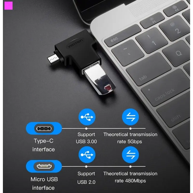 Перехідник Vention USB 3.1 Type-C / USB 3.0 OTG AF / microUSB BM (CDIB0) призначений для синхронізації, передачі даних периферійних пристроїв і їх компонентів з роз"ємом OTG USB і USB Type C, а також micro USB 5 pin, без необхідності підключення до ПК.Наприклад, цифровий фотоапарат можна підключати до фотопринтеру безпосередньо, якщо вони обидва підтримують стандарт USB OTG. До моделей КПК і комунікаторів, що підтримують USB OTG, можна підключати деякі USB-пристрої. Зазвичай це флеш-накопичувачі, цифрові фотоапарати, клавіатури, миші та інші пристрої, які не потребують додаткових драйверів.