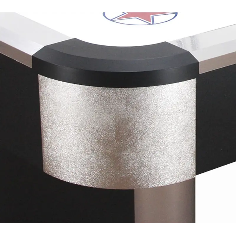 - Борти покриті матеріалом проти ударів і подряпин. Заокруглені кути, покриті чорним ПВХ із алюмінієвими вставками, а також відсутність гострих країв підвищують безпеку столу.