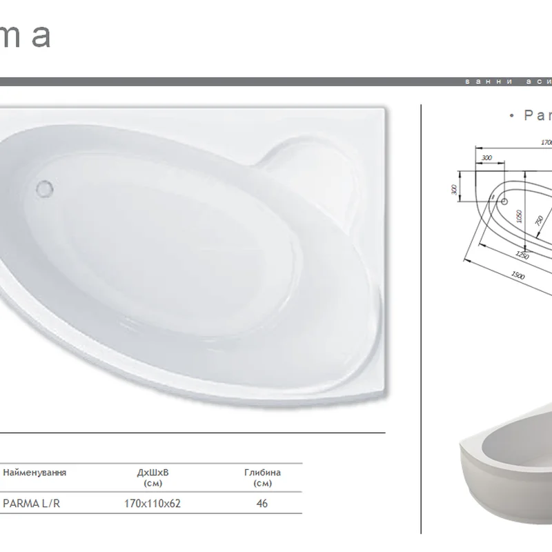 Акрилова ванна Redokss San PARMA 1700x1100 правостороння - зроблена з литого акрилу – це надійне та сучасне рішення для вашої ванної кімнати. Завдяки армованій конструкції, вона має суцільнолиту структуру, високу міцність, стійка до тріщин, подряпин та деформацій. Легкість та простота установки:Акрилова ванна має невелику вагу, що полегшує її транспортування та встановлення. Це особливо важливо для багатоповерхових будинків та невеликих ванних кімнат.Теплоізоляція:Акрил має відмінні теплоізоляційні властивості, завдяки чому вода в акриловій ванні остигає набагато повільніше, ніж у металевій. Це дозволяє довше насолоджуватися теплою водою та економити на підігріві.Безшумність:Поглинає звук води, що ллється, роблячи прийняття ванни більш комфортним і тихим.Гігієнічність:Акрилова поверхня гладка та непориста, що перешкоджає розмноженню бактерій та грибків. Легко чиститься і не потребує особливого догляду.Стійкість до пошкоджень:Ванна виготовляється з високоміцного литого акрилу, стійкого до подряпин, сколів та інших ушкоджень. Навіть якщо на поверхні ванни з'явиться невелика подряпина, її можна легко усунути за допомогою спеціальних засобів.Довговічність:При правильному догляді акрилова ванна служитиме до 15 років і більше, зберігаючи свій первинний зовнішній вигляд та функціональність.Товщина стінки ванни Redokss San - від 8мм до 1см, додатково посилене армоване дно.!!! Увага, у комплектацію ванни не ходить каркас та ніжки. Для замовлення звертайтесь до менеджера.
