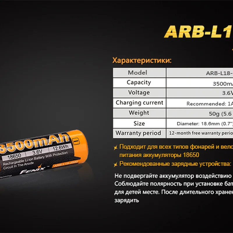 Компанія Fenix випустила ще одну модель акумулятора затребуваного формату 18650. Нею став ARB-L18. Цей акумулятор може заряджатися до 3500 мАч, що є найбільшим значенням серед усіх акумуляторів цього бренду, виконаних в типорозмірі 18650. Тому він підходить абсолютно для всіх ліхтарів, які потребують елементах живлення даного розміру, включаючи навіть найбільш потужні моделі. При цьому, він в змозі забезпечити тривалу роботу ліхтарів в режимах великої яскравості.