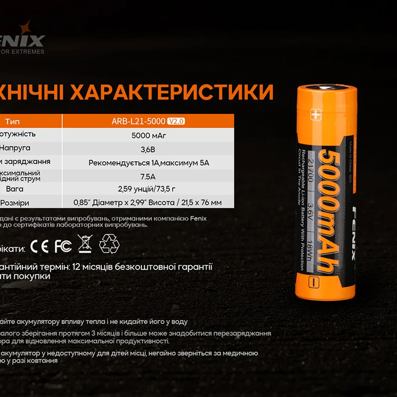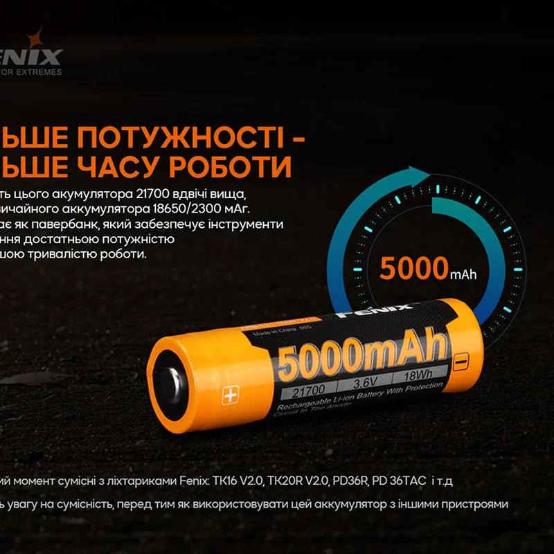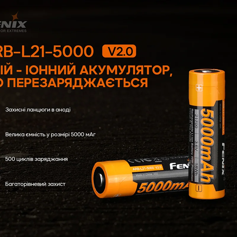 Акумулятор V2.0 є вдосконаленою версією ARB-L21-5000 і на відміну від попередньої моделі сумісний із усіма ліхтарями Fenix, що підтримують формат 21700. Елемент із номінальною напругою 3.6 В пропонує рекордну ємність 5000 мАг, яка дозволяє продовжити час роботи ручних ліхтарів на максимальних режимах.