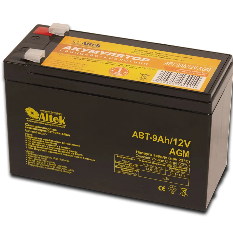 Акумулятор Altek ABT-9Аh/12V AGM – якісна свинцево-кислотна АБ, призначена для надійного електропостачання споживачів у складі автономних та гібридних фотоелектричних станцій. У батареях AGM використовується пористий скловолоконний заповнювач відсіків корпусу, що вбирає електроліт. Ця технологія має низку конструктивних та технологічних переваг.Ключові особливості: акумулятор для сонячної електростанції Altek ABT-9Аh/12V AGM забезпечує більш високу потужність на виході; запобігає газоутворенню та витоку кислоти; швидка швидкість заряду, ніж у залитих моделях; низький саморозряд – близько 3% ємності на місяць; рекомендована глибина розряду до 50% ємності; режим роботи – буферний, допустимо застосовувати у циклічному режимі; аgm-стекломат попереджає утворення осаду на пластинах та розшарування електроліту; висока стійкість до корозії; спектр робочих температур довкілля -10℃ …+40℃; тривалість служби до 5 років за правильної експлуатації.Altek ABT-9Аh/12V AGM має вдосконалену конструкцію – він не вимагає обслуговування та доливання води/електроліту, можна розташовувати практично в будь-якому положенні.