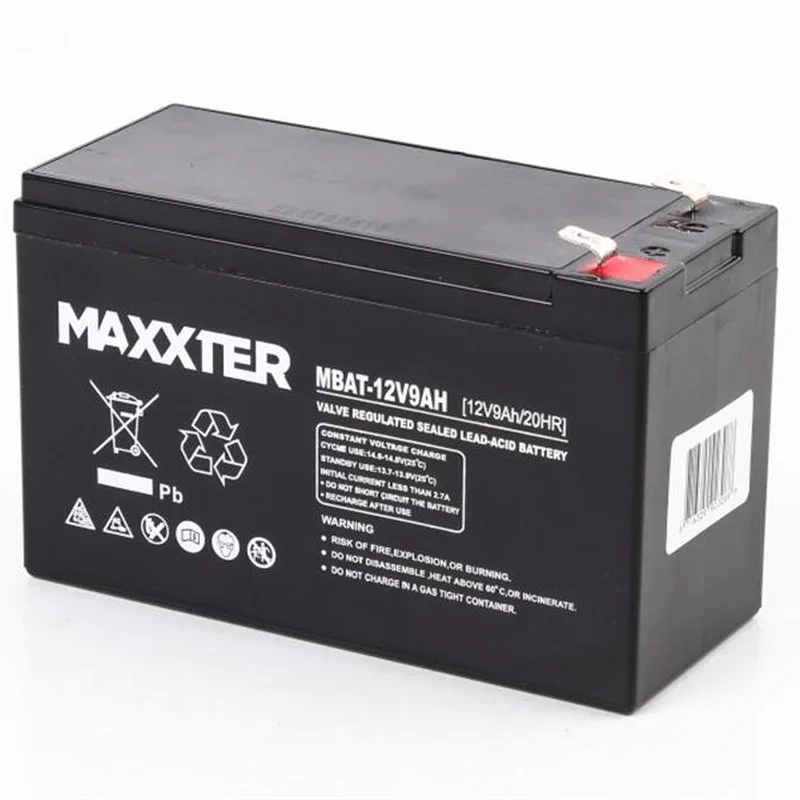 Акумуляторна батарея для джерела безперебійного живлення є невід’ємним елементом, завдяки їй, устаткування продовжує працювати при відключеній електроенергії. Акумуляторні батареї вбудовуються в ДБЖ і практично не вимагають ніякого обслуговування. Батарея до ДБЖ Maxxter 12V 9AH - свинцево-кислотна батарея, що не потребує обслуговування, з номінальною напругою 12В і місткістю 9 Ач. Також дана батарея характеризується низьким рівнем саморозряду. Призначення: джерела безперебійного живлення, централі, охоронні сигналізації. Додаткові характеристики: електроліт має гелевидний стан, не боїться нахилу і перевороту. Залежно від функціонування ДБЖ, акумуляторні батареї Maxxter 12V 9AH при необхідності автоматично заряджаються в будь-який час, коли джерело підключене до мережі.