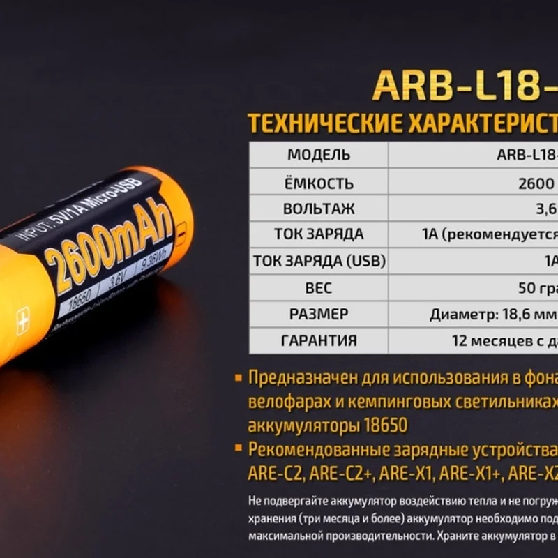 Літій-іонний акумулятор-один з найбільш затребуваних елементів живлення з можливістю повторної зарядки. А моделі у форматі 18650 мають достатній запас заряду, щоб підтримувати роботу навіть по-справжньому енергоємного обладнання. Так, ARB-L18-2600U отримав ємність 2600 маг і відмінно підійде в комплект до світлодіодних ліхтарів або інших приладів.