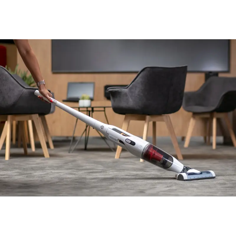 Постійна потужність Завдяки потужній літієвій батареї 20000 мАг ви не відчуєте втрату потужності під час збирання. Навіть при половинній зарядці пилосос працює з максимальною потужністю. Просте очищення контейнера Одним рухом відкрийте клямку, від'єднайте контейнер і витрусіть пил. Контейнер встановлюється на місце за лічені миті. Тривалий час роботи Нова літієва батарея значно збільшує тривалість роботи, порівняно з попередніми моделями. 60 хвилин без підзарядки дозволяють забрати весь будинок за один раз! Час безперервної роботи залежить від обраної швидкості, типу покриття для підлоги і необхідної потужності всмоктування. Новий тип батареї вимагає менше часу на підзарядку: лише 4-6 годин, і пилосос знову готовий до роботи. Акумулятор, що знімається Це автономний пилосос. Не потрібно паркувати його на зарядній станції. Зручна складна ручка дозволяє прибрати пилосос на зберігання в невелику шафку, а від'єднаний акумулятор можна заряджати будь-де.