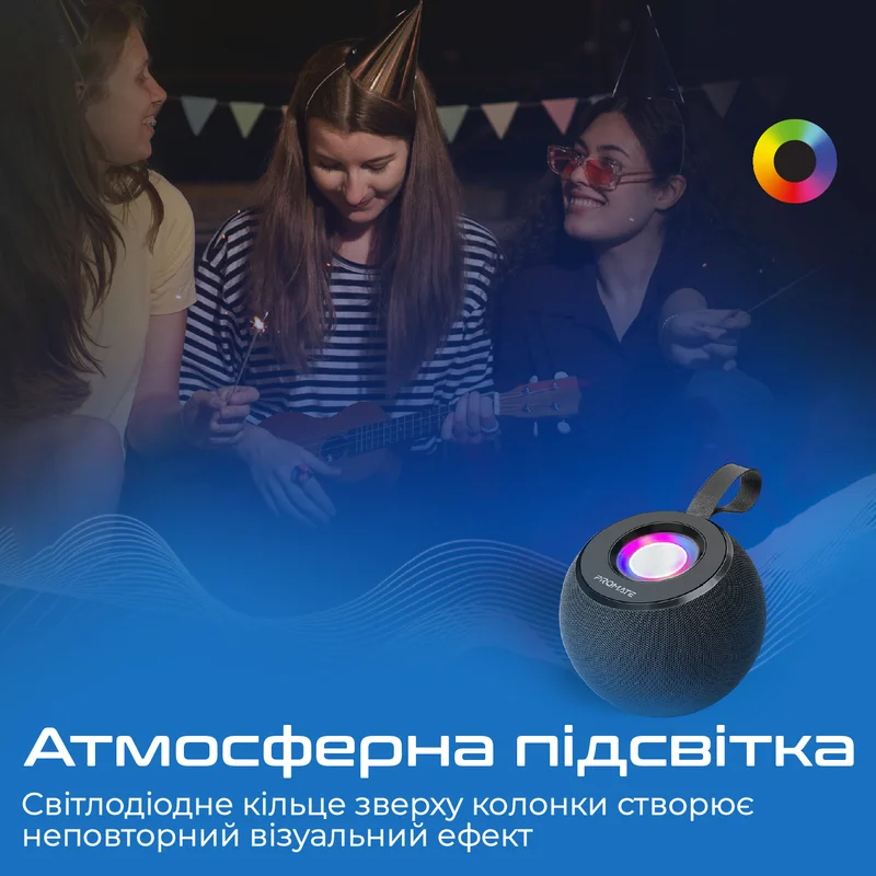 Об’ємне звучання на 360° з фірмовим підсвічуванням LumiSound та в компактному корпусі з першокласних матеріалів. Promate Juggler - стильна колонка для прогулянок та активного відпочинку. Особливості: -Неймовірне звучання на 360°: Динамік на 5W і сучасний чіп Bluetooth 5.1, забезпечать несподівано потужний та якісний звук для подібного форм-фактора. -Атмосферна LED підсвітка: Світлодіодне кільце зверху колонки створює неповторний візуальний ефект, з можливістю відключення. -Bluetooth 5.1: Завжди стабільний і якісний сигнал без переривання та відставання аудіодоріжки від потокового відео. Радіус дії до 10 м. -Li-ion батарея 1200 mAh: Слухай улюблені треки до 4 годин у режимі non-stop. Повністю зарядити колонку можна за 2 години через USB-С кабель, який йде в комплекті. -Функція TWS (True Wireless Stereo): Підключай одночасно 2 колонки до одного пристрою та насолоджуйся стерео ефектом. -3 варіанти з’єднання: Слухай музику по Bluetooth (до 10 м), через MicroSD карту або USB порт (через флешку) об’ємом до 64 Гб. -Зручне управління: При включенні Juggler автоматично підключається до останнього збереженого пристрою. 5 кнопок та перемикач OFF/ON на корпусі контролюють всі необхідні функції. -Стильний і продуманий дизайн: Корпус виготовлений з приємного на дотик пластику й обтягнутий першокласним текстилем. Завдяки невеликому розміру та маленькій вазі, легко поміщається в руку, та наявність петлі дає змогу носити ґаджет із собою. -Широка сумісність: Колонка повністю сумісна з усіма пристроями з підтримкою Bluetooth будь-яких версій.