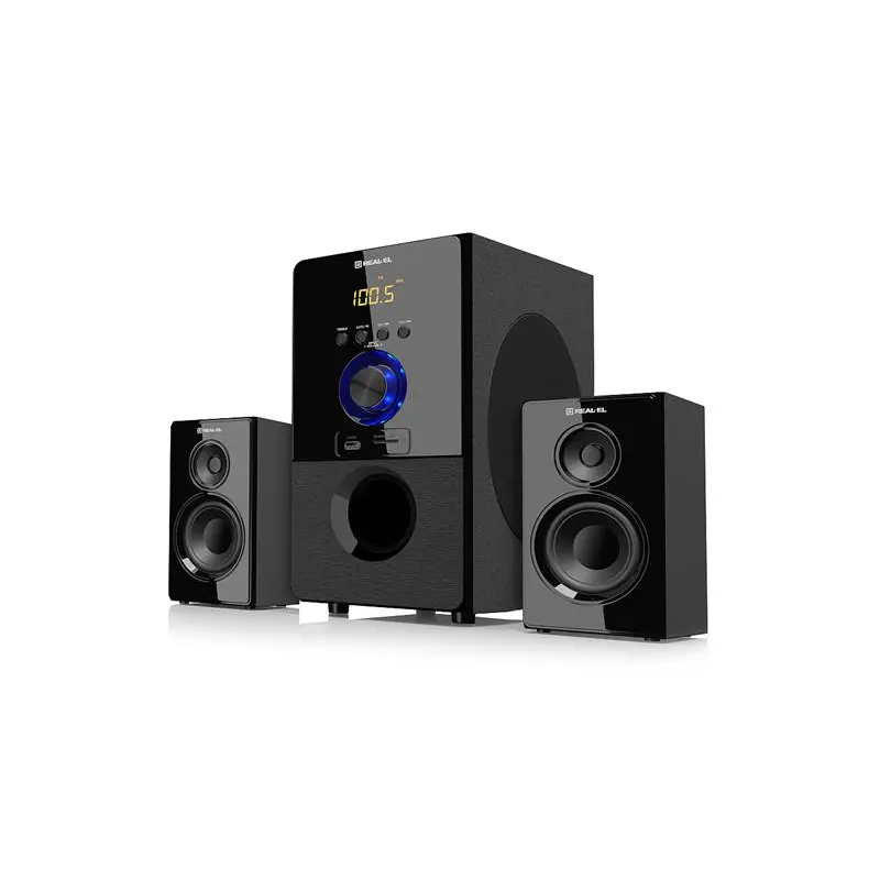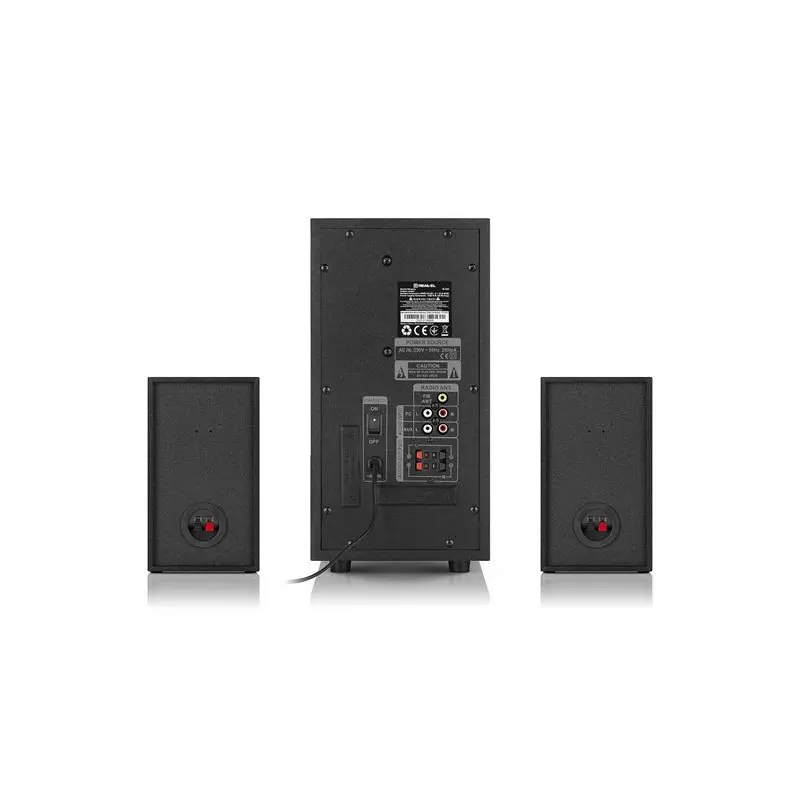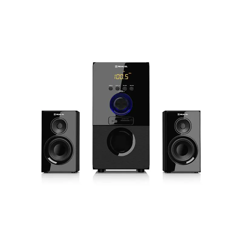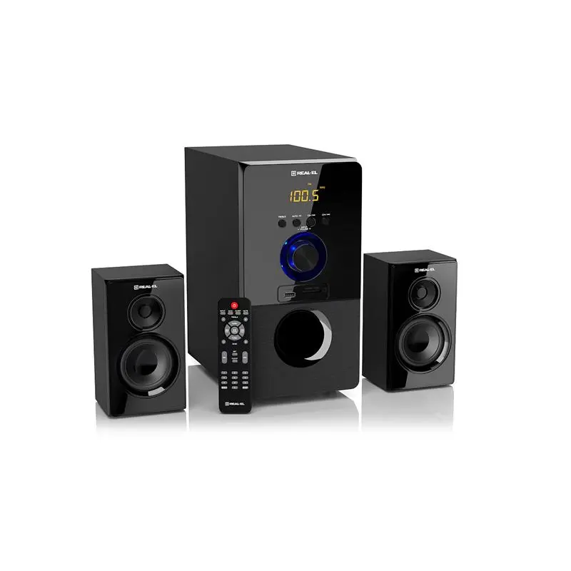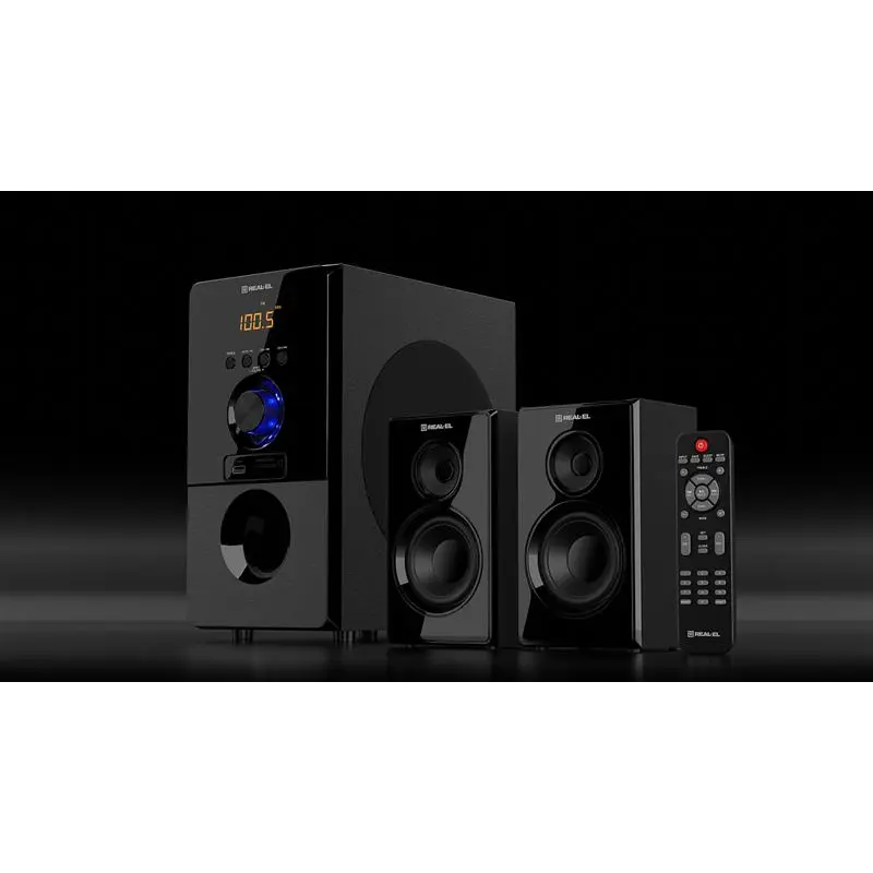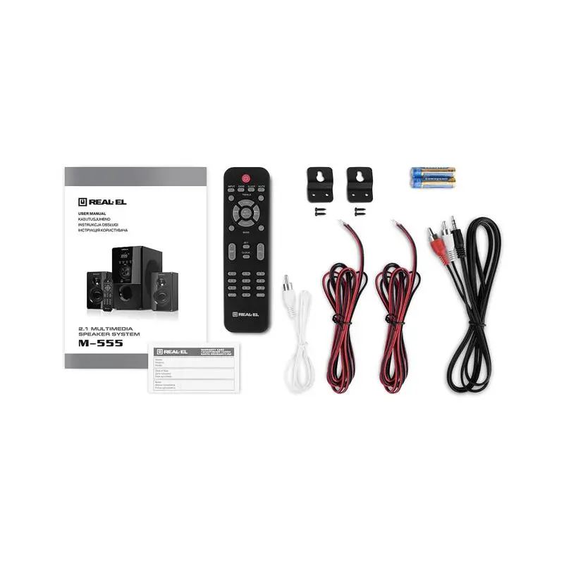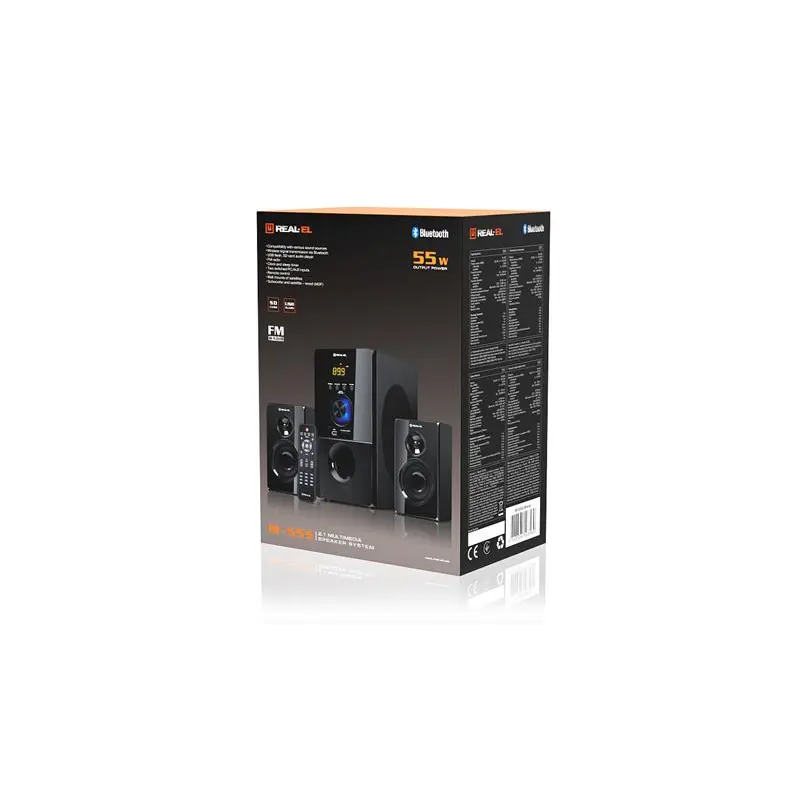 Акустична система 2.1 REAL-EL M-555 - це потужна, універсальна та зручна акустична система 2.1, створена для відтворення музики та здатна забезпечити вражаючий звуковий супровід під час перегляду фільмів, геймінгу, домашніх вечірок тощо. Для шанувальників глибоких низьких частот вона оснащена потужним сабвуфером. Завдяки сумісності з різними джерелами звуку ви можете насолоджуватися улюбленою музикою з будь-якого пристрою. Бездротова передача сигналу через Bluetooth, програвач аудіофайлів з USB ?ash та SD card, вбудоване FM-радіо, годинник та таймер вимкнення доповнюють функціонал системи. Вона також обладнана двома комутованими входами PC/AUX, пультом дистанційного керування та можливістю настінного кріплення сателітів. Елегантний дерев’яний корпус (MDF) сабвуфера та сателітів додасть естетики та гарантує чисте та глибоке звучання. ОСОБЛИВОСТІ Сумісність із різними джерелами звуку Бездротова передача сигналу через Bluetooth Програвач аудіофайлів USB flash, SD card FM-радіо Годинник та таймер вимкнення Два комутовані входи PC/AUX Пульт дистанційного керування Можливість настінного кріплення сателітів Матеріал корпусу – дерево (MDF)
