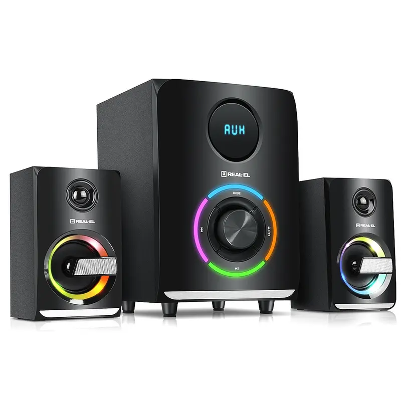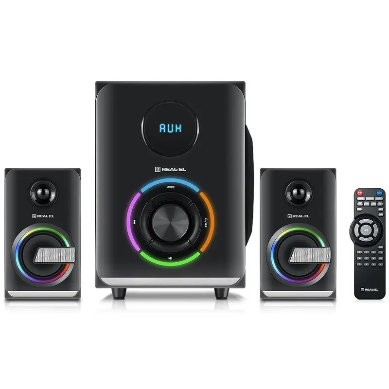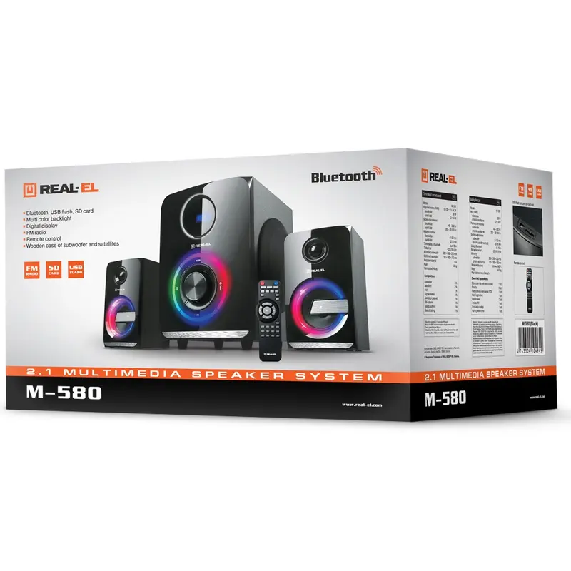 Мультимедійна акустична система 2.1 REAL-EL M-580 - робимо преміальність доступною! Сучасний дизайн з багатокольоровим підсвічуванням та якісне звучання акустики REAL-EL M-580 стануть гармонійною прикрасою Вашої кімнати та допоможуть Вам повною мірою насолодитися улюбленими фільмами, іграми, музикою або прослухати улюблену радіохвилю. Колонки REAL-EL M-580 можуть бути підключені практично до будь-яких джерел аудіо сигналу і мають сучасні опції: пульт дистанційного керування, вбудований Bluetooth-модуль і FM-радіо, програвач аудіо файлів з USB Flash і SD card. Сабвуфер і сателіти REAL-EL M-580 виготовлені з дерева (MDF) і дають можливість почути повний спектр частот і отримувати задоволення від детального об’ємного потужного звуку.