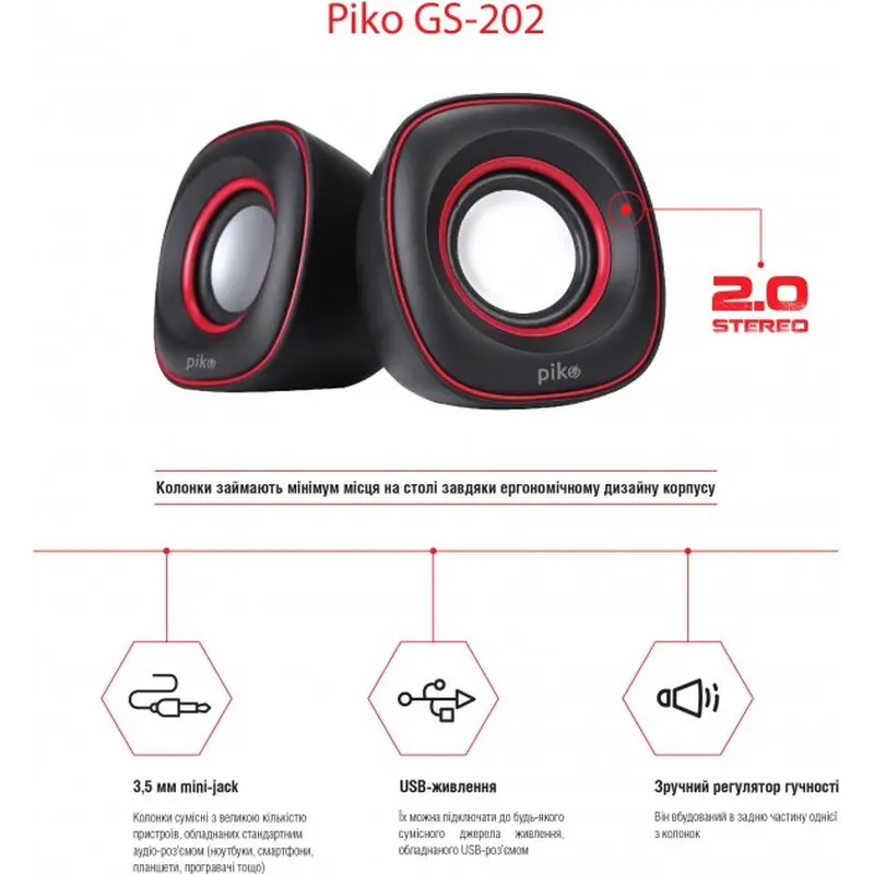 Компактні стереодинаміки Piko GS-202, які живляться через USB-порт комп’ютера або ноутбука або будь-якого сумісного джерела живлення (5 В). Є чудовим рішенням для тих, хто економить вільне місце на робочому столі. Завдяки стандартному аудіоштекеру 3.5 мм (mini-jack) колонки сумісні з великою кількістю пристроїв (комп’ютери, ноутбуки, плеєри, смартфони, планшети тощо). Вбудований у корпус регулятор дає змогу зручно та точно вибирати потрібну гучність.