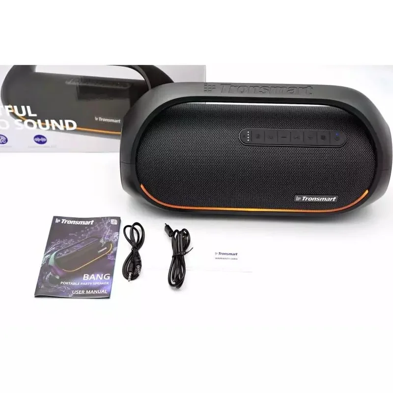 Сучасна та потужна (60 Вт) бездротова колонка Tronsmart Bang із захистом IPX6. Відмінний варіант для відпочинку на природі та в компанії. Широка ручка дозволяє зручно використовувати колонку як переносну, а технологія TuneConn дає можливість об’єднувати відразу кілька колонок для роботи від одного джерела. Пара слів про сам бренд Tronsmart, який є досить давно на ринку. Фактично, це один із найпристойніших варіантів бездротових колонок серед китайських брендів. До того ж, колонки, як правило, гратимуть голосно і чисто, а найголовніше — вони досить недорогі за своєю вартістю. Ще з перших моделей Mega розпочалося моє особисте знайомство з колонками Tronsmart. З того часу з’явилася і швидка зарядка формату USB Type-C, і фірмова технологія покращення звучання Tronsmart SoundPulse. Топові моделі, такі як Bang, додатково підтримують спосіб об’єднання колонок в стереопару TuneConn. Відзначу наявність захисту IPX6 - це помітно допомагає при використанні колонки на вулиці. У комплект поставки колонки Bang входить інструкція та гарантійний талон, а також два кабелі – для підзарядки та для підключення зовнішнього аудіоджерела. Зовнішній вигляд колонки Tronsmart Bang нагадує класичні бумбокси, хіба що без касетоприймачів та дисководів. Це досить великий корпус (довжина 36 см) і широка ручка від краю до краю колонки. Майже всю поверхню самої колонки займає захисна сітка-гриль. На ручці та на нижній частині сітки в кутку є логотип Tronsmart. Керування розширене - панель з прогумованими кнопками та додатковими клавішами (EQ, Сonnect, керування підсвічуванням). На задній частині під захисним ущільненням розміщено інтерфейси: AUX, USB-C, USB-A, рідер для карток. У колонці розташовані два великі НЧ-динаміки (4 Ом, 30 Вт кожен) і ще пара широкосмугових динаміків. З обох боків розташовані пасивні випромінювачі, що дозволяють «качати» в такт з основними. Заявлена ??сумарна звукова потужність – 60 Вт. Колонка реально гучна для розмірів. Розробники Tronsmart Bang використовували цікаву «фішку» — світлодіодні панелі на базі світловодів. Одна U-подібна смуга розташована по всій ширині корпусу на фасаді, ще дві кільцеві панелі – навколо пасивних випромінювачів. При роботі можна активувати світломузичні ефекти, підсвічування або вимкнути світло через програму або з кнопкової панелі. Відзначу заявлений захист від води рівня IPX6. Колонка всередині має проклеювання з водовідштовхувального матеріалу, динаміки та пасивні випромінювачі захищають «внутрішню» від потрапляння води. Кнопки оснащені гумовою накладкою, а інтерфейсна панель – жирна гумова заглушка. Ні легкий дощ, ні бризки води чи бруду, ні краплі поту не зашкодять електроніці. Саме для вулиці і для гучних дружніх посиденьок на природі.