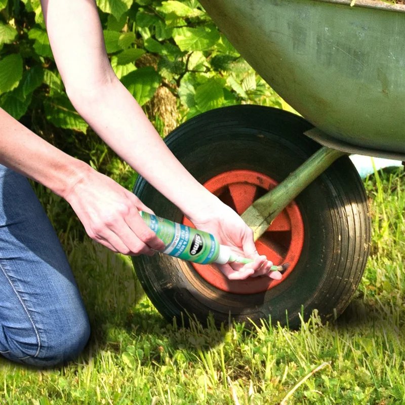 Герметик совместим с системой контроля давления TPMS, он не засоряет и не повреждает устройство, но может вызвать ложное срабатывание сразу после заливки жидкости в колесо. В комплекте идет инструмент для снятия сердечника клапана, а также остальные элементы, которые позволяют без труда залить жидкость внутрь колеса.