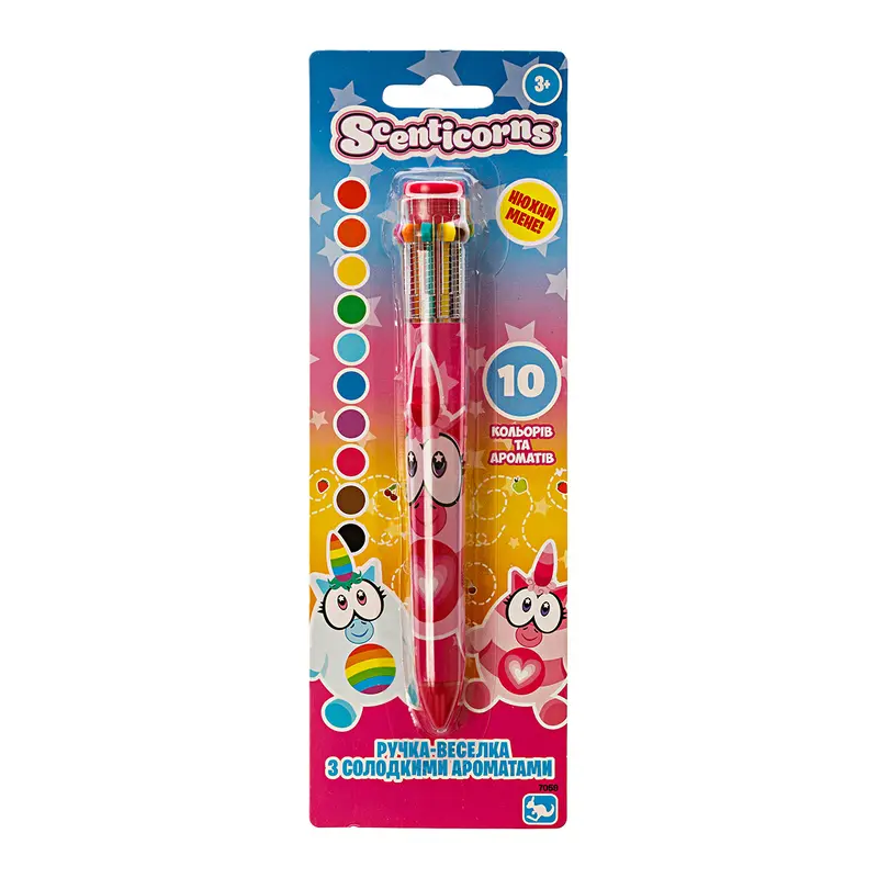 Шариковая ручка с 10 цветами и ароматизированными чернилами. Забавные рисунки, яркие цвета и фруктовые запахи — канцелярия SCENTICORNS влюбляет в себя в первого взгляда! Радужная ручка порадует творческих малышей. Это отличный инструмент для развития воображения, зрительного и эмоционального восприятия. Рисуйте и делайте заметки “вкусными” ручками SCENTICORNS вместе с ребенком и превратите процесс письма в увлекательное занятие. В наборе — 1 ручка с 10 цветами чернил и фруктовым запахом в ассортименте. Для детей от 3 лет.