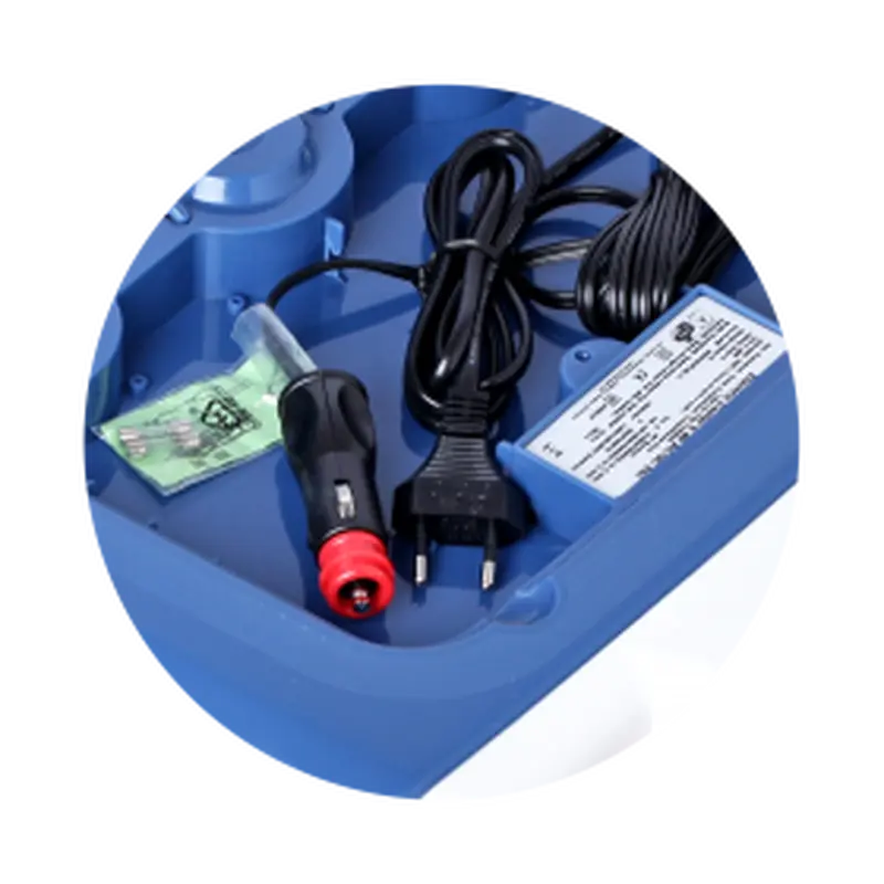 Відсік для зберігання шнура живлення та штепсельних вилок (12V і 230V) розташований в кришці. Холодильник можна приєднувати до будь-якого джерела живлення усередині Вашої машини, що має напругу 12 V (наприклад, до прикурювача). Вбудований перетворювач напруги дозволяє працювати холодильника від звичайної електричної мережі.