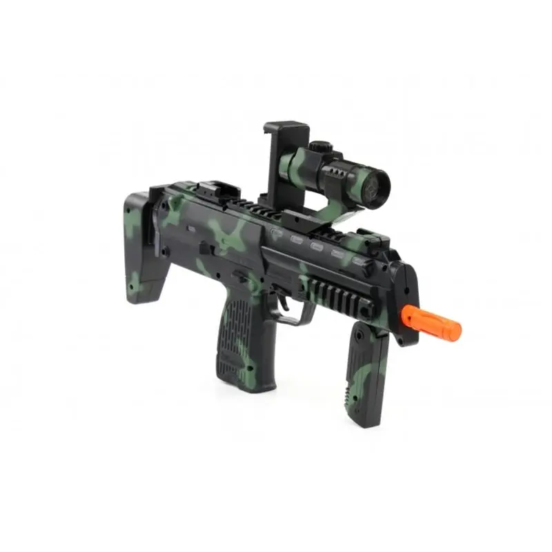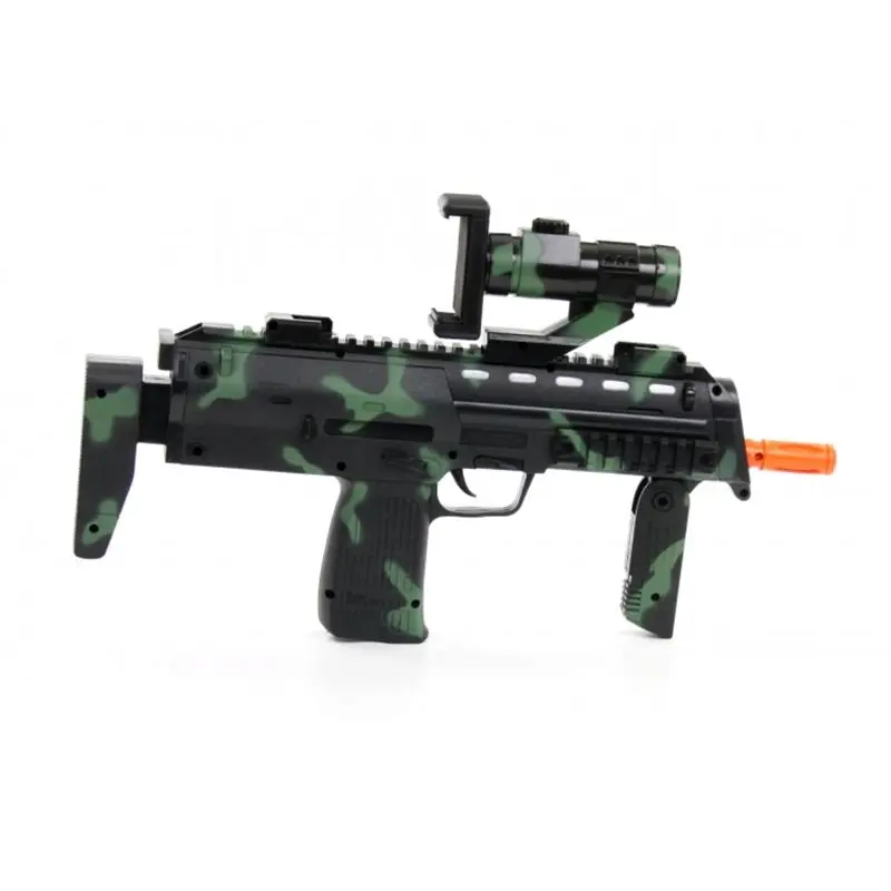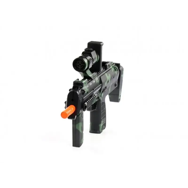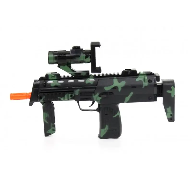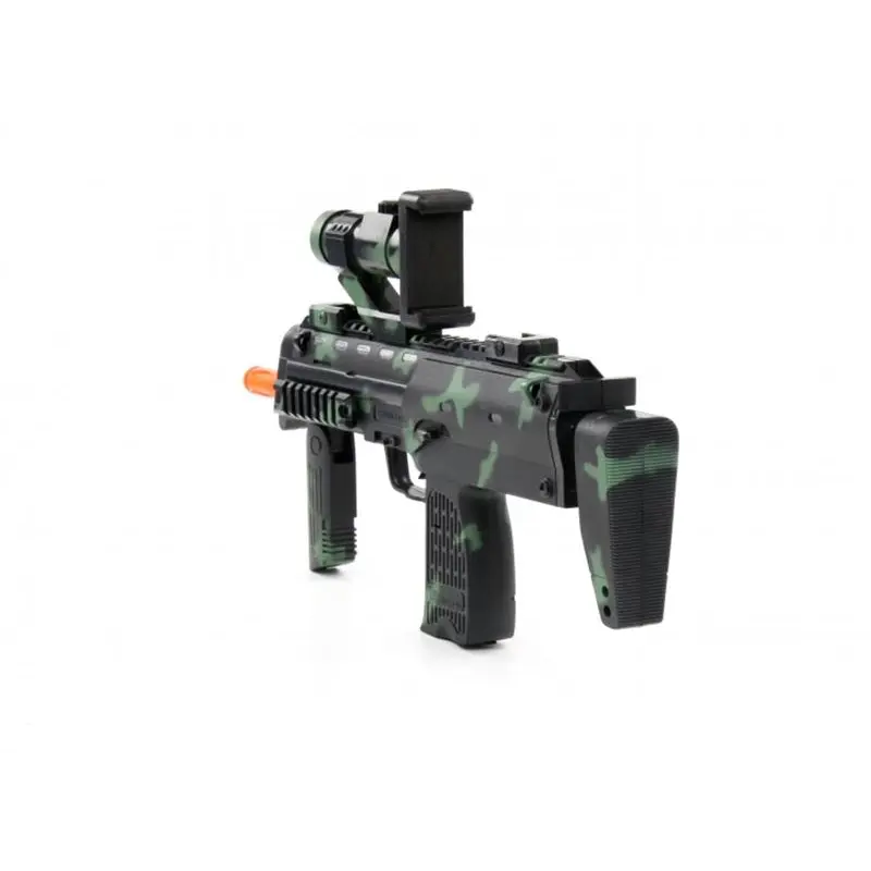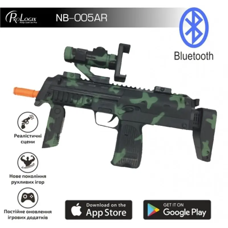 Автомат AR-Glock gun ProLogix NB-005AR унікальний гаджет який дозволить об"єднати реальний світ і віртуальну реальність. Звичайні ігри на смартфоні хоч і захоплюючі, але через особливості ігрового процесу малорухливі що скажемо так не зовсім добре, а для дитини яка проводить багато часу граючись на смартфоні навіть шкідливо - автомат AR-Glock gun ProLogix NB-005AR здатний кардинально змінити уявлення про мобільну гру перетворивши її на яскраву, захоплюючу і рухливу гру. Гаджет по виду нагадує справжній автомат, що ще більше підсилює враження в грі і вам дійсно доведеться натискати на спусковий гачок і цілиться в супротивника повертаючись урізнобіч так, як автомат сприймає зміну положення і кут огляду змінюється з поворотом тіла гравця, а грати можна як в приміщенні так і на вулиці. Синхронізація зі смартфоном здійснюється за допомогою інтерфейсу Bluetooth.Додаток для мобільного пристрою можна завантажити на Playmarket або Appstore залежно від моделі смартфона. Для гри потрібно завантажити по QR коду, що йде в комплекті з гаджетом додаток, а так само ігри і встановити їх на мобільний пристрій, а сам смартфон закріпити на гаджеті і потім синхронізувати пристрої за допомогою Bluetooth. Автомат виконаний з пластику високої якості і має ергономічну форму щоб виключити втому під час гри і підійде як дорослим так і дітям. Живлення гаджета здійснюється від трьох батарей АА. AR-Glock gun ProLogix NB-005AR подарує масу яскравих вражень від захоплюючих шутерів і цей пристрій доповненої реальності робить відеогру по-справжньому рухливою