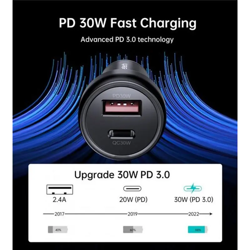 Швидка зарядка Зарядний пристрій Choetech TC0014 з вихідною потужністю 60 Вт забезпечує дуже швидку зарядку. Використовуючи порт USB Type-C, ви можете наполовину зарядити акумулятор пристрою лише за 45 хвилин. Це майже в 3 рази швидше за передачу енергії, ніж у стандартних зарядних пристроях, що використовуються в автомобілях. Незважаючи на таку високу потужність, вам не доведеться турбуватися про безпеку – розподіл живлення оптимально керується внутрішньою мікросхемою. Два різні порти USB Два USB-порти дозволяють заряджати два пристрої одночасно, незалежно від того, яким штекером вони оснащені. Зарядний пристрій має стандартний порт USB та USB Type C, збагачений технологією Power Delivery. USB Type C – це порт, популярний серед іншого у смартфонах, тому зарядний пристрій Choetech TC0014 – це пристрій, який слід мати із собою під час кожної подорожі. Компактні розміри Виробник подбав про те, щоб зарядний пристрій не займав занадто багато місця, тому його розміри дійсно компактні. Пристрій майже повністю прихований у гнізді прикурювача, створюючи враження заводського елемента автомобіля.