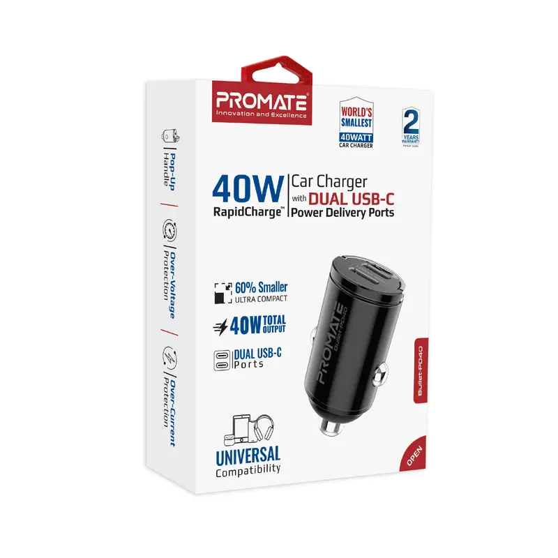 Promate Bullet-PD40 - найменший в світі автомобільний зарядний пристрій з підтримкою 40W Power Delivery. Легко зарядить девайси та стане непомітним, але дуже важливим елементом в інтер’єрі твого авто. Особливості: 2 через 1: Заряджай 2 пристрої одночасно на сумарній потужності до 40W. 2хUSB-C 20W Power Delivery: Блискавична швидкість заряджання смартфона, планшета чи повербанка. Працює в трьох режимах - 5V/3А, 9V/2.22А, 12V/1.67А. Технологія адаптивної зарядки: Автоматично підбере оптимальний і безпечний рівень потужності, в залежності від твого пристрою. Безпека: Вбудований чіп Smart IC захистить підключені девайси від стрибків напруги, короткого замикання та надмірної зарядки. Компактність: Ґаджет (21х41х21 мм) із світлодіодним індикатором зарядки повністю поміщається в прикурювачі. Витягується за допомогою міні-ручки. Першокласні матеріали: Аксесуар з анодованого алюмінію стійкий до перегріву та відрізняється великим запасом міцності. Надійна посадка: В прикурювачах різних типів, завдяки пружинним фіксаторам на корпусі