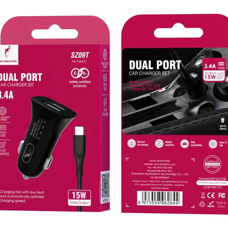 Автомобільний зарядний пристрій SkyDolphin SZ09T (2USB, 3.4A) Black (AZP-000110) + кабель Type-C