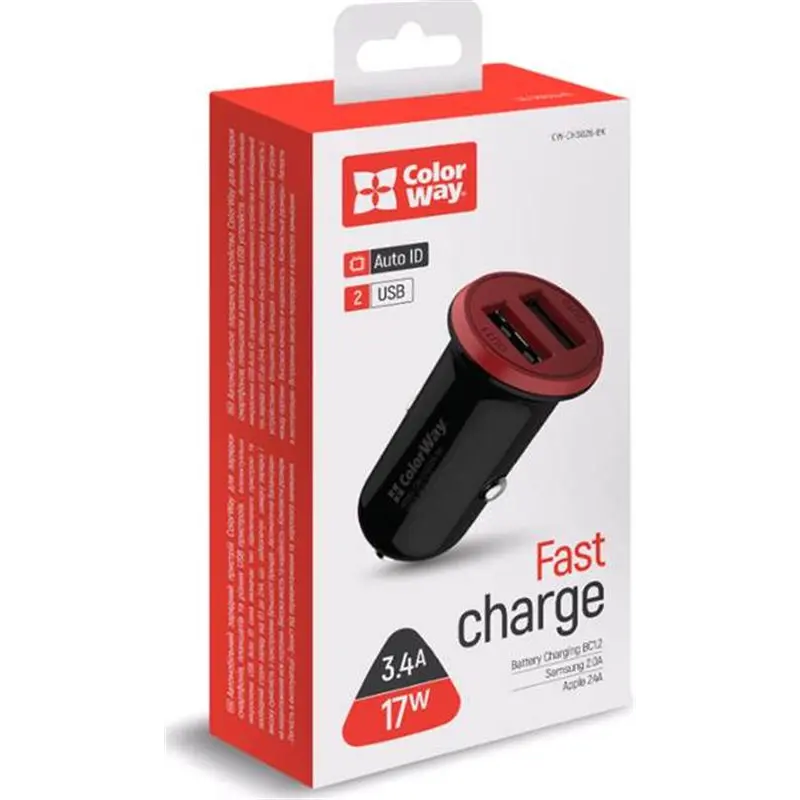 Автомобільний зарядний пристрій ColorWay (2USB,3.4A, 17W) Red/Black (CW-CHA026-BK)