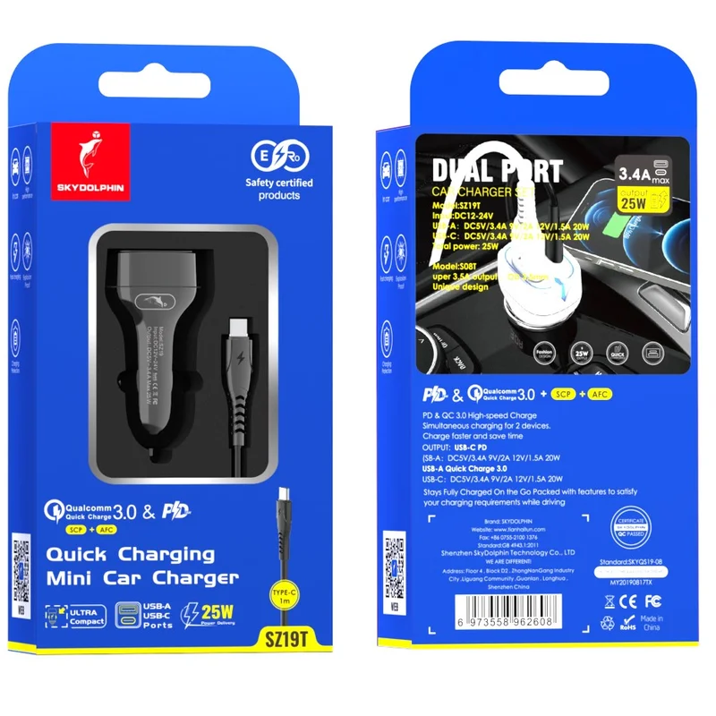 Автомобільний зарядний пристрій SkyDolphin SZ19T PD 20W + QC3.0 20W Black (AZP-000104) + кабель Type-C