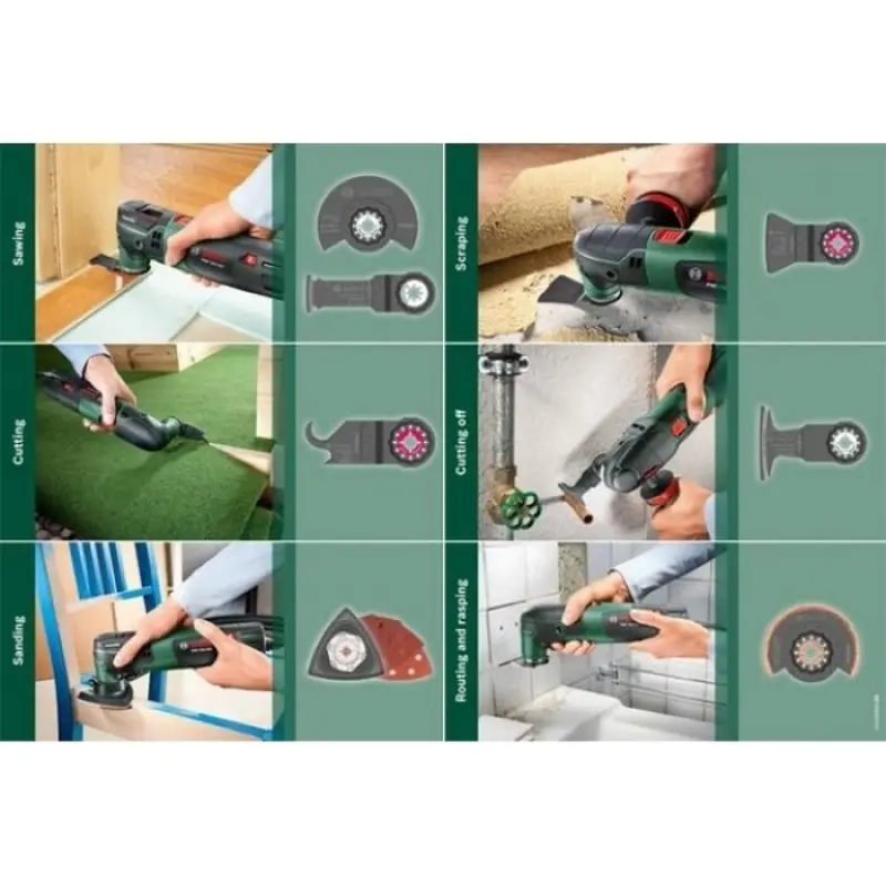 Комплектация: сегментований пильний диск Bosch BIM ACZ 85 EB (2609256943), набір шліфлистів (2609256A54), шліфувальна пластина 93 мм АВЗ 93 G (2609256956), пилка 32х40 мм AIZ 32 EPC (2609256947), шестигранний ключ, обмежувач глибини, кейс