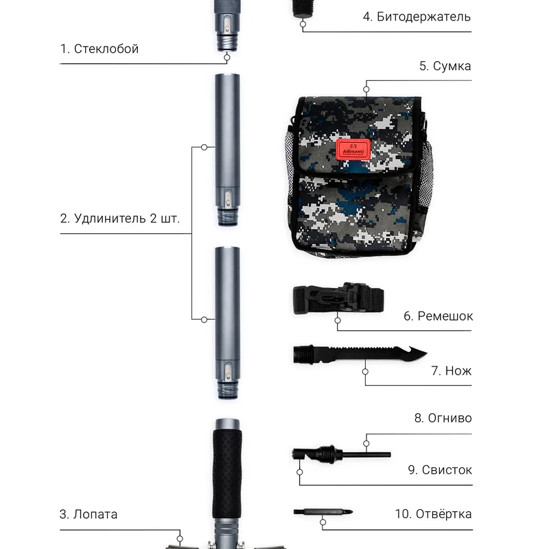 Доступний інструментарій даної моделі включає у собі ряд пристосувань, які є базовими для портативної туристичної лопати і зустрічаються в інших модифікаціях лопат Adimanti.
