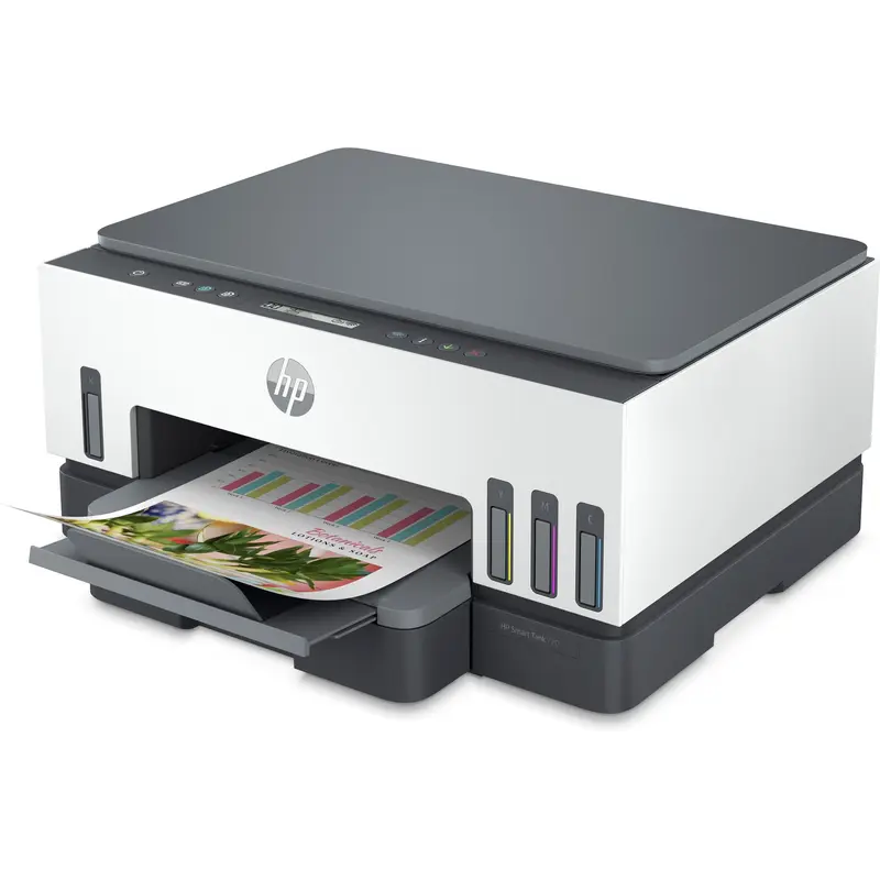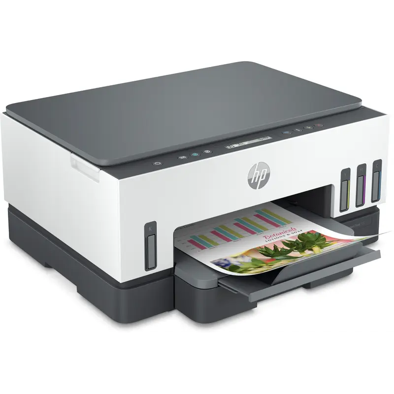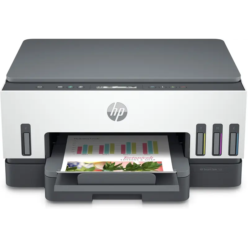 HP Smart Tank 720 All-in-One Спростіть друк в домашніх умовах завдяки простий налаштуванні на мобільних пристроях, автоматичного двостороннього друку, кнопок з інтелектуальним керуванням і безперебійній роботі принтера. Крім того, оціните додаткову вигоду при великих об’ємах друку. У комплект поставки входять оригінальні чорнила HP, яких вистачить до трьох років друку. Друк – це так просто Використовуйте відео з покроковими інструкціями для швидкої налаштування принтера. Великий запас чорнила за вигідною ціною У комплект входять оригінальні чорнила HP для друку до 18 000 чорно-білих і до 8 000 кольорових сторінок. Підвищіть продуктивність роботи вдома Пришвидшіть роботу з багатосторінковими документами за допомогою функції автоматичного двостороннього друку. Екологічно безпечний друк При виготовленні цього принтера використовуються матеріали, отримані після переробки принтерів і інших електронних пристроїв, зміст яких становить понад 25% від загальної маси пластикових деталей.