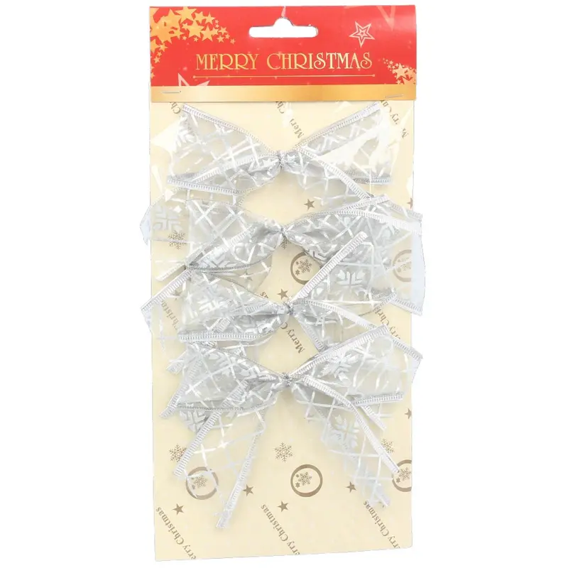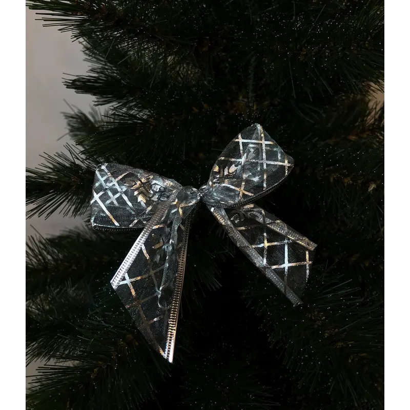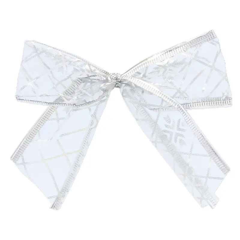 Комплект з чотирьох декоративних бантиків від бренду Chomik стане яскравим акцентом у новорічному оформленні. Кожен бантик виконаний з легкої органзи сріблястого кольору з елегантною глянцевою окантовкою по краях і прикрашений сріблястим геометричним візерунком. Завдяки розмірам 10 х 10 см і міцному кріпленню на дроті, банти зручно фіксуються на ялинкових гілках, новорічних композиціях або упаковках подарунків. Текстильний матеріал поєднує в собі легкість і стійкість форми, що робить вироби придатними для багаторазового використання. Компактна упаковка дозволяє зручно зберігати банти між сезонами.Особливості Органза зі сріблястою глянцевою окантовкою створює святкове світіння і витонченість в будь-якому оформленні, доповнюючи як класичні, так і сучасні новорічні стилі. Блискучий візерунок з геометричним малюнком додає виробу виразності і робить його помітним елементом декору. Кріплення на дроті забезпечує надійну фіксацію банта і дозволяє легко змінювати його положення без втрати форми. Легка вага і стійкість до деформації роблять банти практичними у використанні, особливо при створенні складних композицій і декоративних елементів. Висока якість текстилю гарантує довговічність виробу навіть при багаторазовому застосуванні в святкових оформленнях.Варіанти використання Ідеально підходять для прикраси новорічної ялинки, надаючи їй завершеного і гармонійного вигляду з елементами блиску і текстильної фактури. Можуть використовуватися як ефектні декоративні акценти при оформленні подарунків, святкових коробок або пакетів. Прекрасно поєднуються з ялиновими вінками, гірляндами і свічковими композиціями, додаючи в інтер'єр елемент урочистості. Підходять для декорування банкетних залів, вітрин і фотозон, де потрібен легкий, але виразний акцент.*Реальний колір товару може дещо відрізнятися від зразків, представлених на сайті, залежно від технічних налаштувань Вашого екрану, а також, з огляду на особливості матеріалу, відтінок товару може змінюватися залежно від освітлення.