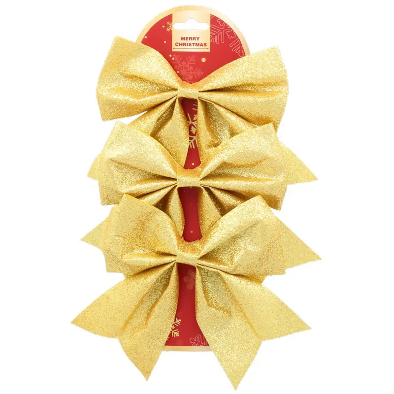 Набір декоративних бантів Chomik — це ефектний акцент для святкового оформлення, який додає простору блиску та урочистості. У комплект входять три великі банти розміром 16×14 см, виготовлені з текстилю з глітерним покриттям, що створює виражений ефект мерехтіння при освітленні. Золотистий колір підкреслює святковий настрій, а завдяки зручному кріпленню на проволоці банти легко закріпити на ялинці, подарунковому пакуванні, гірляндах чи інших елементах декору.Особливості Глітерне покриття надає прикрасам яскравого блиску, що красиво відбивається при денному або штучному світлі. Золотистий текстильний матеріал виглядає розкішно та гармонійно поєднується з класичним новорічним оздобленням. Гнучка проволока дозволяє надійно зафіксувати бант на різних поверхнях — від гілок до текстилю. Комплект із трьох бантів зручно зберігати у поліетиленовому пакеті, що захищає вироби від деформації.Варіанти використання Для оздоблення верхівки або гілок ялинки, надаючи їй святкового завершення. Як частина оформлення подарункових коробок або новорічних кошиків. У створенні композицій для вікон, дверей, арок або святкових фотозон. Для прикрашання інтер'єру кафе, магазинів чи офісів у зимовий період.*Реальний колір товару може кілька відрізнятися від зразків, представлених на сайті, в залежності від технічних налаштувань Вашого екрану, а також, враховуючи особливості матеріалу, відтінок товару може змінюватися в залежності від освітлення.