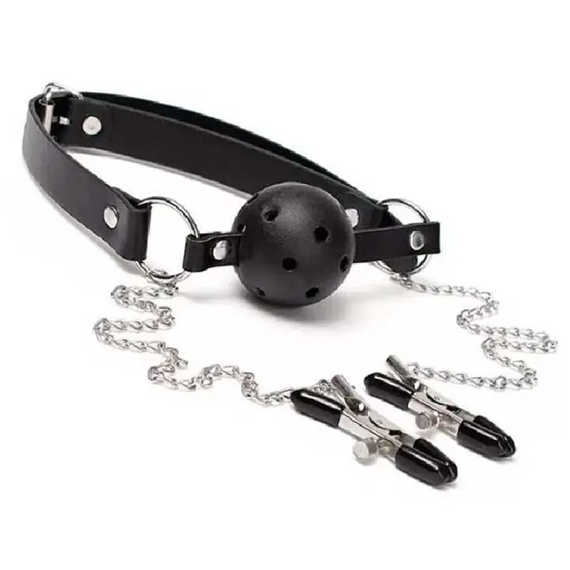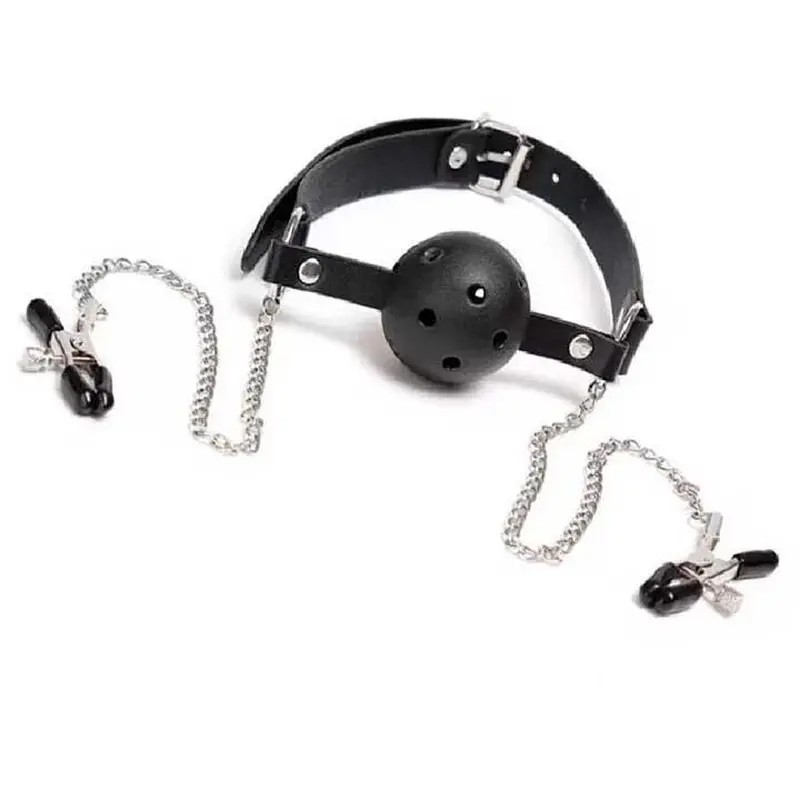 БДСМ Кляп: пластикова кулька з отворами на ремінці з регульованою застібкою. Металеві затискачі для сосків із гумовими наконечниками, регулятором шурупом.nРозмір: довжина ремінця 62 см, діаметр кулі 4,5 см.nМатеріал: екошкіра, пластик, метал.nПаковання: прозорий поліетиленовий пакет із липким клапаном.