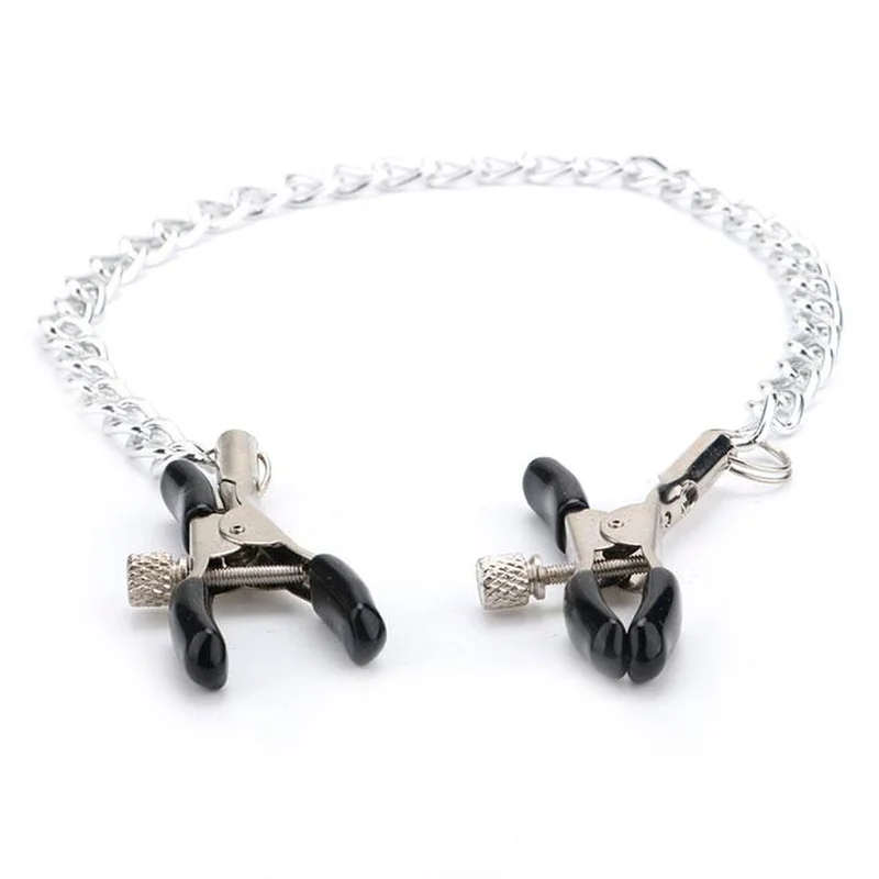 БДСМ Металеві затискачі для сосків з гумовими наконечниками та шурупом-регулятором з'єднані ланцюжком.Розмір: затискачі 6 см, ланцюжок 32 см.Матеріал: метал, гума.