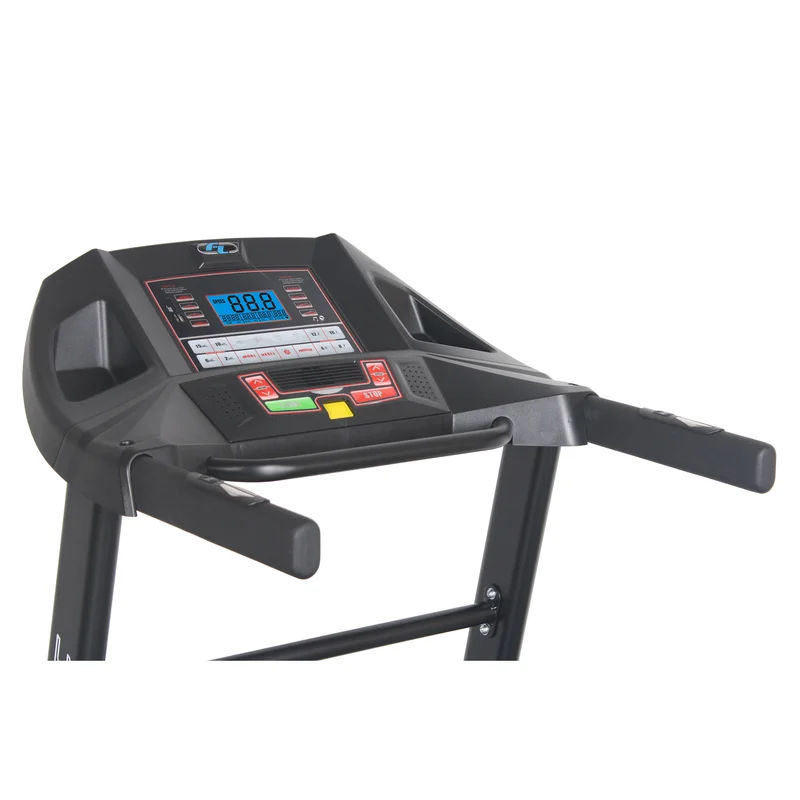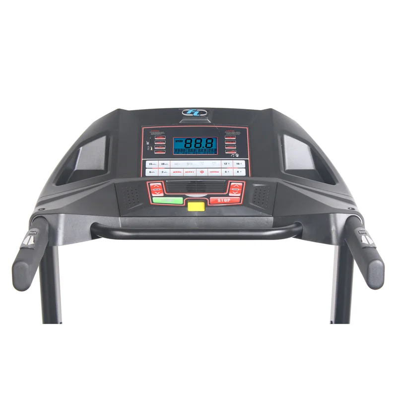 - Беговая дорожка FitLogic T15 имеет консоль управления, в которую инсталлирован 5-ти дюймовый LCD дисплей с голубой подсветкой на который выводятся: скорость, время, дистанция, угол наклона, калории и пульс. Под экраном органично вписалась аудиосистема со встроенными динамиками и входом для подключения телефона или аудиоплеера. А для абсолютного комфорта пользователя, в консоль встроен вентилятор. Справа и слева от дисплея расположены вместительные ниши для личных вещей.