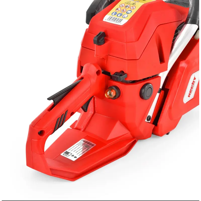 Бензопила - HECHT 56 оснащена ТНВД і напівавтоматичним дроселем. Тому запуск дуже простий за допомогою правильному відрегульованню. Для ергономічного дизайну використані сучасні матеріали, високоякісна сталь, легкі алюмінієві сплави та міцний пластик. Їх правильним поєднанням досягається відмінна стійкість, оптимальний баланс і мала вага. Рукоятки відповідної форми дозволять надійно та безпечно тримати її в усіх робочих положеннях. Інструмент оснащений антивібраційною системою, яка максимально пригнічує передачу неприємних вібрацій на ручку, викликаних потужним двигуном. Таким чином, руки не піддаються надмірному навантаженню від вібрацій і працювати набагато комфортніше. Пилка оснащена запобіжним гальмом, а середній час зупинки ланцюга з максимальної швидкості становить 0,1 с.. Ще одним елементом безпеки є розміщення пари пускових елементів на головній рукоятці, що значно знижує ризик ненавмисного запуску перемикання ланцюга при запуску двигуна. Бензопилка оснащена сталевим упором для зубів, який при правильному використанні запобігає вискакуванню пилки з розрізу в разі ударів, викликаних, наприклад, захопленням ланцюга в розрізі. Змащування ланцюга та шини забезпечується автоматично під час різання за допомогою насоса з бака, вбудованого безпосередньо в пилку.