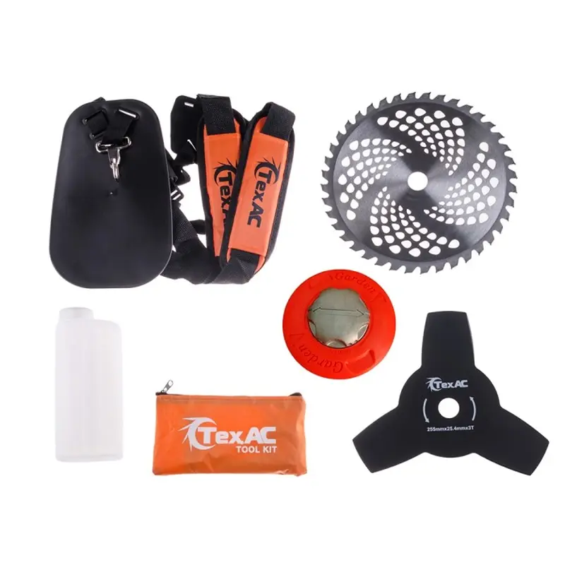 ранцевий жилет, ємність для приготування паливної суміші, набір ключів для збирання мотокоси, трипелюстковий ніж, пильний диск, напівавтоматична шпулька з ліскою, плечевий ремінь