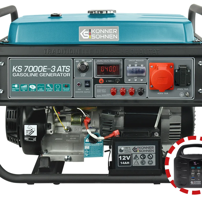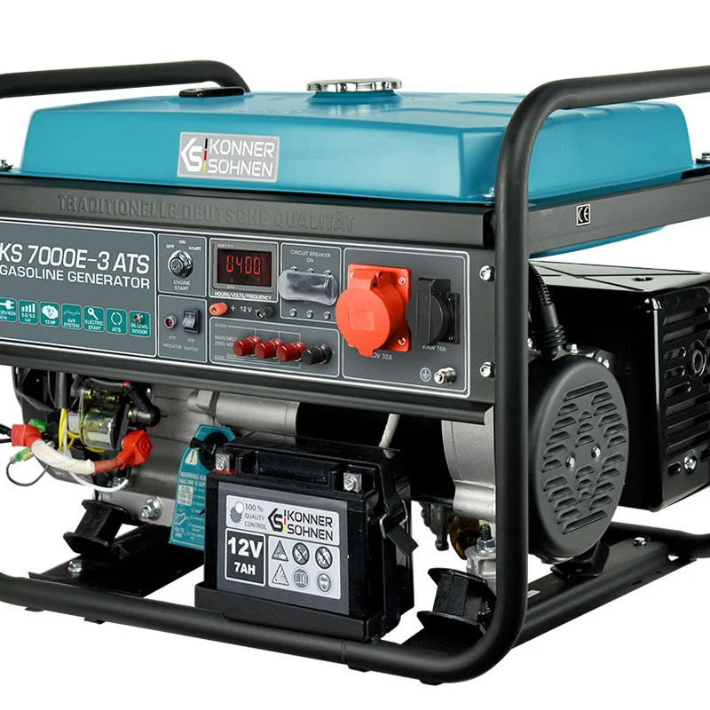 Однією з унікальних особливостей моделі генератора KS 7000E-3 ATS з електрозапуском є функція ATS (АВР — автоматичне введення резерву). Ця функція дозволяє генератору автоматично включатися в момент відключення світла, а потім автоматично вимикатися в момент повернення електроживлення. Вона необхідна в разі використання об’єкту жінками або літніми людьми, при від’їздах, на об’єктах із суворим температурним або світловим режимом. У моделях інших брендів для виконання даної функції необхідно купувати громіздке, дороге обладнання, яке потребує додаткової, складної установки. У нашому випадку блок вже встановлений в генератор, інсталяція такого генератора максимально спрощена, а вартість даних моделей торгової марки «Könner & Söhnen» є доступною для будь-якого гаманця.