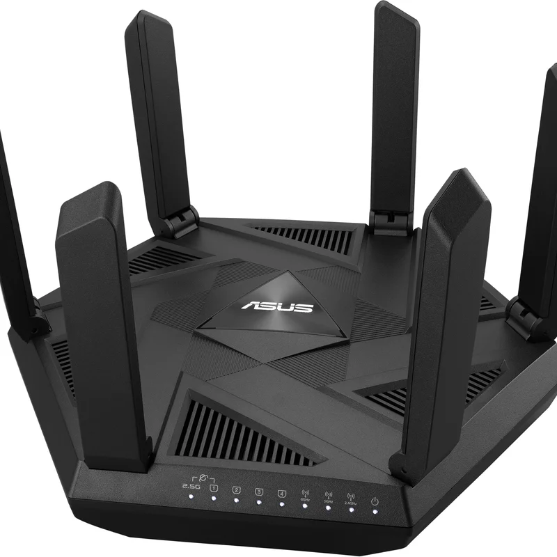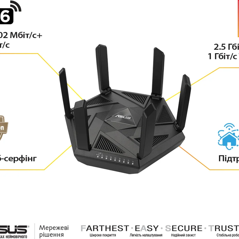 Тридіапазонний маршрутизатор класу AXE7800: стандарт Wi-Fi 6E (802.11ax), новий діапазон 6 ГГц, ASUS Safe Browsing, система інформаційного захисту AiProtection Pro, підтримка спільного зашифрованого VPN-з’єднання (Instant Guard), засоби батьківського контролю, порт 2.5G Ethernet, об’єднання каналів Швидкісний стандарт Wi-Fi 6E. Новий діапазон частот 6 ГГц значно збільшує пропускну здатність мережі, забезпечує вищу продуктивність Wi-Fi і більш стабільне з’єднання зі швидкістю до 7800 Мбіт/с. Захист в один дотик. Функція ASUS Safe Browsing для блокування небажаного вмісту в один дотик, фільтрування результатів пошуку. Безпека будь-де. Вбудована система інформаційної безпеки AiProtection Pro на базі рішень Trend Micro. Де б ви не були, технологія ASUS Instant Guard забезпечує безпечний доступ в Інтернет за допомогою шифрованого VPN-з’єднання. Засоби батьківського контролю. Гнучкі налаштування для захисту дітей від Інтернет-загроз. Підтримка AiMesh. Легке розширення покриття бездротової мережі за допомогою AiMesh-сумісних маршрутизаторів ASUS.