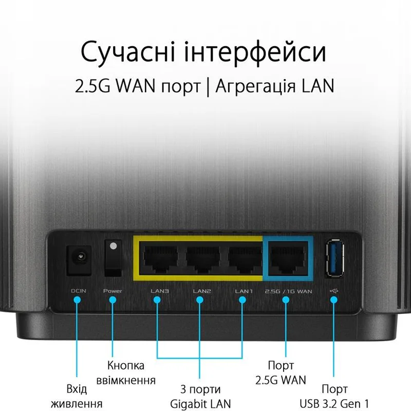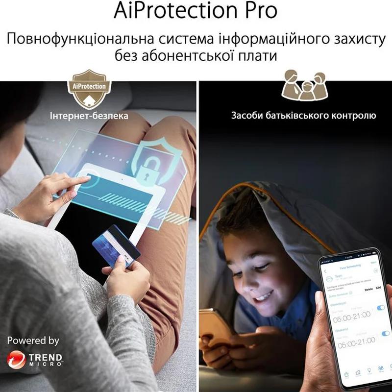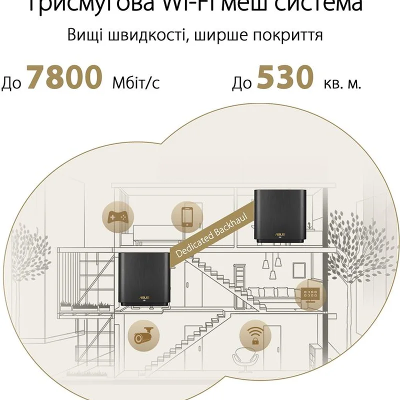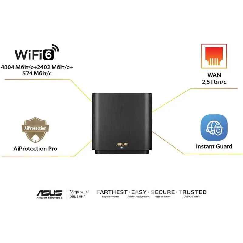 Бездротова комірчаста система ZenWiFi XT9. Вона призначена для розгортання швидкісної, надійної та захищеної мережі Wi-Fi в приміщеннях великого розміру. Збільшена зона покриття. У поєднанні з флагманським чипсетом Broadcom стандарту Wi-Fi 6, ексклюзивна технологія RangeBoost Plus збільшує зону покриття мережі Wi-Fi на 38% - до 530 квадратних метрів! Просте налаштування та адміністрування. Мобільний застосунок ASUS Router - це інтуїтивно зрозумілий інтерфейс для налаштування параметрів комірчастої мережі Wi-Fi прямо зі смартфона. Швидке налаштування в три простих кроки. Щоб швидко налаштувати роботу комірчастої системи, просто дотримуйтесь екранних інструкцій. Підтримка голосових команд. Система ZenWiFi XT9 підтримує голосове керування за допомогою віртуальних асистентів Google і Alexa. Гнучкий вибір магістрального підключення. Під’єднання вузлів системи ZenWiFi XT9 здійснюється або по Ethernet-кабелю, або по бездротовому діапазону 5 ГГц. Причому оптимальний тип під’єднання може вибиратися автоматично. Швидкісне дротове підключення. Для дротового підключення до інтернету система ZenWiFi XT9 пропонує порт 2.5G Ethernet. Також вона дає змогу об’єднати кілька портів локальної мережі, щоб отримати пропускну здатність у 2 Гбіт/с. Повноцінний захист для домашньої мережі. Захист домашньої мережі від кіберзагроз стає дедалі гострішою проблемою, у міру того як у наших будинках використовується дедалі більше цифрових пристроїв, багато з яких мають недостатньо розвинені засоби безпеки. Ось чому система ZenWiFi XT9 постачається із захисною технологією AiProtection Pro і підтримує зашифроване VPN-підключення (функція Instant Guard). Захисна система AiProtection Pro. У системі ZenWiFi XT9 реалізовано захист від кіберзагроз AiProtection Pro на базі платформи Trend Micro. Також підтримуються стандарт безпеки WPA3 і функції батьківського контролю. Захист для безкоштовних мереж Wi-Fi - Instant Guard. Маршрутизатори ASUS із функцією Instant Guard створюють захищений шифруванням канал передавання даних поверх загальнодоступного під’єднання через Wi-Fi, використовуючи технологію віртуальних приватних мереж (Virtual Private Network - VPN). Активувати цей захист можна в будь-який момент одним натисканням на кнопку, і водночас не потрібно оплачувати жодні підписки!
