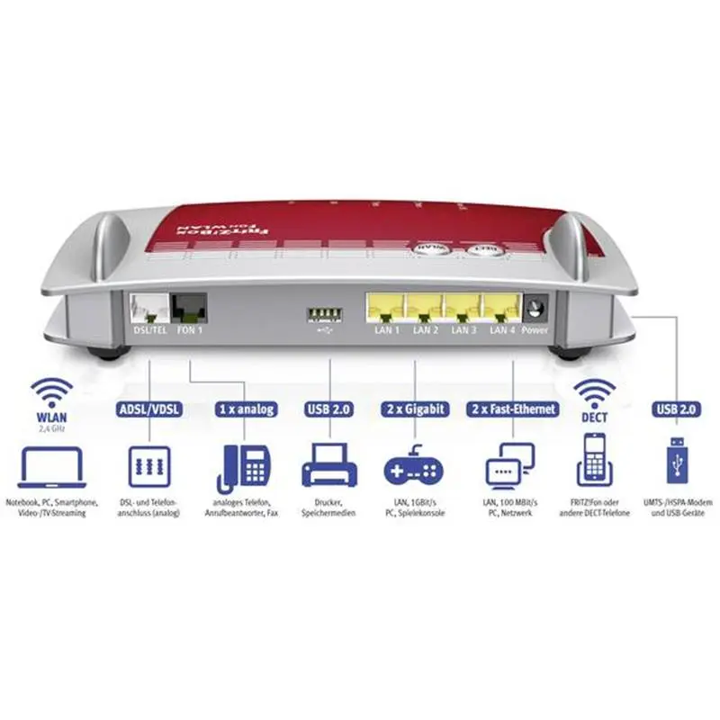 FRITZ!Box 7360 - ідеальний вибір для тих, хто починає свою пригоду з інтелектуальної мережі та використовує дуже швидкі лінії VDSL або кабельні з'єднання наступного покоління. Швидкий WLAN, 4 порти Ethernet (1x LAN/WAN + 3 LAN), базова станція DECT та два порти USB роблять FRITZ!Box 7360 ідеальним центром зв'язку для сучасного дому та офісу. Основний стандарт Wi-Fi: Wi-Fi 4 (802.11n) Швидкість передачі даних WLAN (макс): 300 Мбіт/с Wi-Fi стандартів: 802.11b, 802.11g, Wi-Fi 4 (802.11n) Тип LAN Ethernet інтерфейсу: Гігабітний Ethernet Стандарти мережі: IEEE 802.11b, IEEE 802.11g, IEEE 802.11n Швидкість передачі даних Ethernet LAN: 10,100,1000 Мбіт/с Специфікація DSL: VDSL, ADSL2 + Алгоритми шифрування даних: 128-bit WEP, 64-bit WEP, WDS, WPA, WPA2, WPS Підтримувані мережеві протоколи: IPv6
