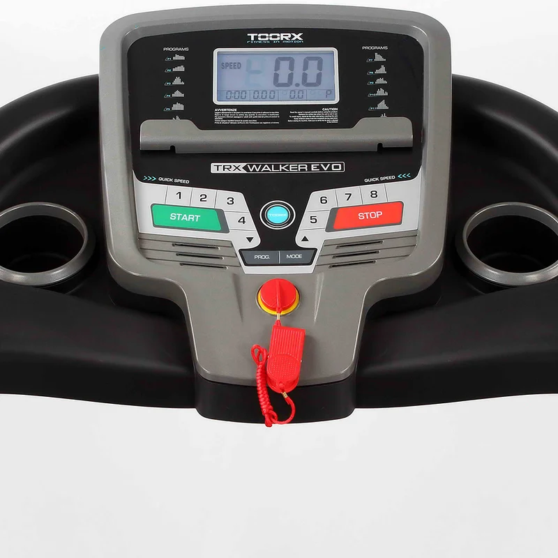 Бігова доріжка реабілітаційна Toorx Treadmill TRX Walker EVO (TRX-WALKEREVO) від італійського виробника Garlando S.p.A. призначена для спортивної ходьби та придатна для фізіотерапії завдяки знімним захисним поручням і регульованому ременю для підтримки попереку. Модель розрахована на максимальну вагу користувача до 110 кг і має двигун постійного струму 2 к.с., який дозволяє розвивати швидкість від 0,4 до 8 км/год. Бігове полотно розміром 127 х 43 см із можливістю ручного регулювання нахилу в трьох положеннях. Система амортизації Shock Absorption знижує навантаження на суглоби та мінімізує ризик отримання травми в процесі занять. Консоль тренажера з LСD-дисплеєм оснащена програмами для користувачів із різними рівнями підготовки. Вбудовані сенсорні датчики вимірювання пульсу будуть доречними під час тренування для контролю частоти серцевих скорочень. Бігова доріжка реабілітаційна Toorx Treadmill TRX Walker EVO (TRX-WALKEREVO) має попередньо зібрану раму та транспортувальні ролики, завдяки чому її легко переміщати по квартирі.