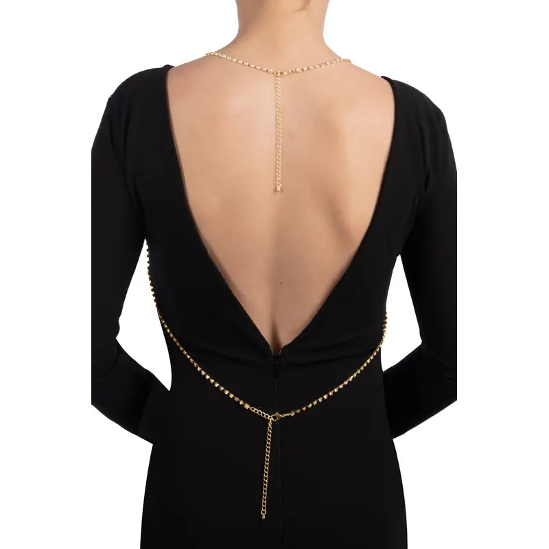 За допомогою прикрас жінка розповідає свою історію та відкриває частину своєї особистості. Розкажіть вашу історію, купіть золотистий ланцюжок для бюста Bijoux Pour Toi - Elena Gold. Елегантний аксесуар з ювелірного сплаву з розсипом страз складається з двох тонких ланцюжків, що починаються на шиї, перехрещуються під грудьми та закінчуються внизу спини.
