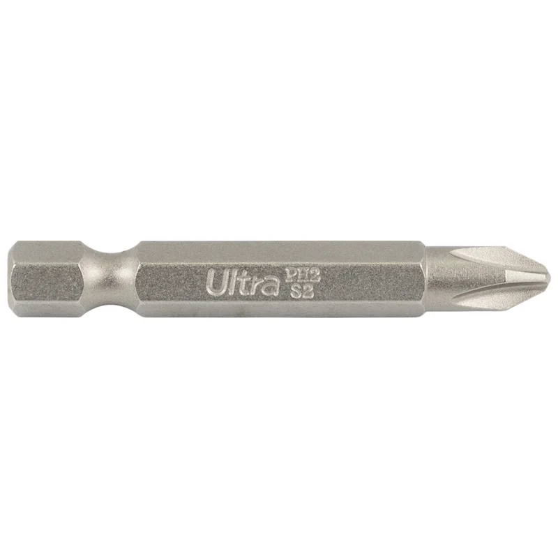 Викруткові біти ТМ ULTRA призначені для професійного використання. Виготовлені з легованої інструментальної сталі S2 з поверхневим зміцненням до твердості 58-61 HRC струмами високої частоти (СВЧ). Мають проточенну головну частину для роботи у вузьких місцях. Точна форма робочої частини забезпечує ідеальну фіксацію в шліцах гвинтів, шурупів, саморізів і т.д. Бічна поверхня відполірована.
