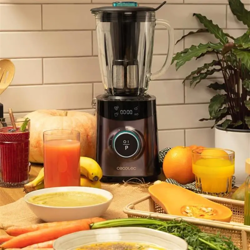 Розумніше, швидше, ефективніше Вітаємо! Ви знайшли той самий блендер, який ідеально справляється із завданням приготувати смузі, крем-суп, коктейль чи пюре. CECOTEC Power Black Titanium 1800 Advance підійде для шанувальників простої, вишуканої гастрономії. Об’єм чаші 1,8 л дозволяє готувати суп або пюре відразу на кілька разів або велику компанію. Титанові леза і забезпечать ретельне подрібнення до однорідної консистенції, а програми допоможуть досягти бажаної текстури. фільтр для м’якоті штовхач у комплекті термостійкий глечик Швидко та якісно Power Black Titanium 1800 Advance оснащений двигуном потужністю 1800 Вт, що обертає леза зі швидкістю до 22 000 обертів на хвилину. При такій інтенсивності однорідність досягається за час від 30 секунд до декількох хвилин. Надійні леза Зазвичай у лез блендера 4 лопаті, але Power Black Titanium 1800 Advance – їх 8. Це теж впливає на ефективність перемелювання. Леза мають чорне титанове покриття, яке захищає від корозії, зберігає заточування та сприяє довговічності. Ідеальний для смузі Фруктові, овочеві або ягідні смузі блендер зробить за секунду. Регулювати текстуру напою можна за допомогою м’якотевого фільтра. Не турбуйтеся про те, що вміст раптом розбризкається: блендер запрацює тільки тоді, коли ви щільно закриєте його кришкою. Програми та режими Для продуктів різної щільності передбачено 10 рівнів потужності та режим Турбо для подрібнення особливо твердих інгредієнтів. Під найчастіші запити розроблені програми: "Соуси та супи", "Дроблення льоду", "Смузі". Включаючи їх, ви автоматично отримуєте потрібну текстуру. Для полегшення догляду за пристроєм використовуйте програму “Автоочищення”. На всю сім’ю Перевага Power Black Titanium 1800 Advance у великому обсязі чаші – 1,8 л. У звичайних блендерах ємності надаються 800 мл або менше. Тобто цей девайс розрахований на приготування для великої родини або компанії гостей. Це зручно ще й тому, що можна приготувати одну порцію супу за раз і їсти кілька днів. Комфорт експлуатації По-перше, блендер виготовлений з якісних матеріалів: ударостійке, термостійке скло (чаша) та нержавіюча сталь (оздоблення та леза). Причому всі знімні деталі можна очищати в посудомийній машині. По-друге, керувати ним зручно завдяки інтуїтивно зрозумілому інтерфейсу з таймером. Для легкого приготування деяких страв є штовхач.