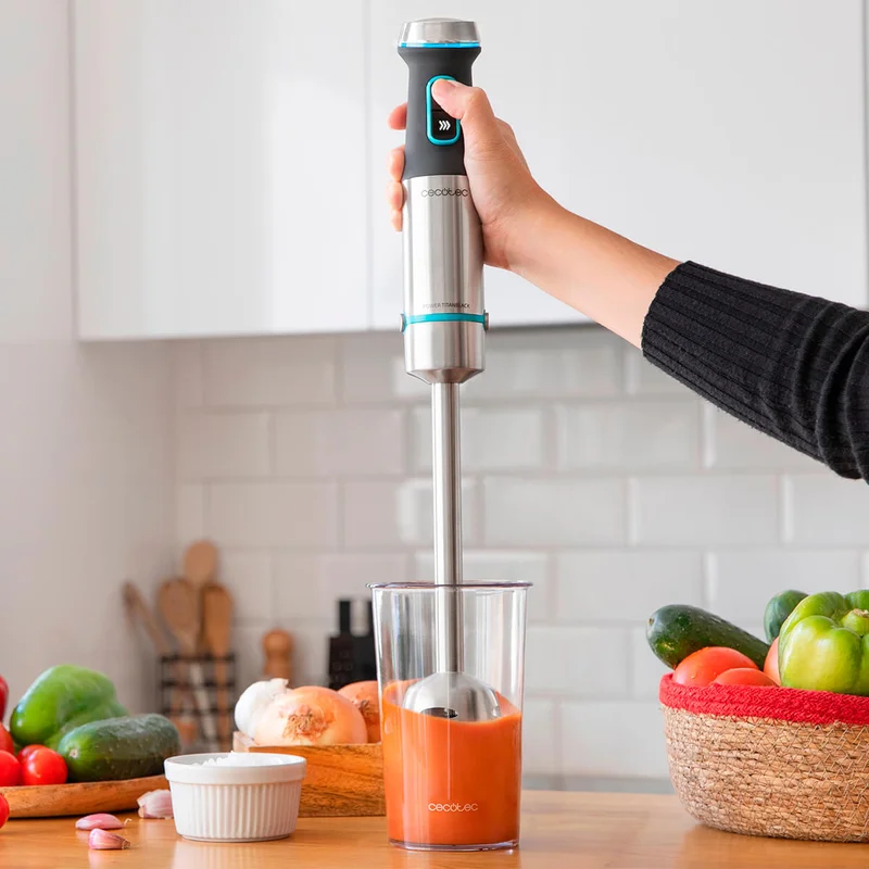 Блендер занурювальний CECOTEC Power TitanBlack 1200 XL Cream Crush Кожен процес готування та кожна деталь Вашої страви буде абсолютно на новому рівні разом із занурювальним блендером CECOTEC Power TitanBlack 1200 XL Cream&Crush. За допомогою чотирьох лез із чорного титану та простого регулювання швидкості, Ви запросто впораєтеся зі стравою будь-якої складності без найменших зусиль. Технологія CrossBlades Просте управління та функція Turbo Стопа розміру XL Ергономічна та зручна конструкція Велика потужність Легке складання та розбирання Комплектація під будь-яке завдання Чистота у пріоритеті Кришка із захистом від бризок забезпечує більш чисте подрібнення, уникаючи попадання бризок на робочу зону. Склянка об’ємом 800 мл із кришкою допоможе вам приготувати усі ваші рецепти та зберігати їх у холодильнику, стільки скільки потрібно Вам. Леза із чорного титану Інноваційна технологія CrossBlades з 4 лезами, покритими чорним титаном, дозволяє миттєво отримувати найкращі результати за рахунок збільшення міцності та максимальної гостроти лез. Це дозволяє легко подрібнювати навіть найтвердіші продукти. Легке керування Завдяки селектору регульованої швидкості та функції Turbo він з максимальною точністю адаптується до потреб будь-якого рецепту. Низькі швидкості ідеально підходять для більш м’яких продуктів або для збивання яєць, а вищі швидкості та функція «Турбо» — для змішування твердіших продуктів, таких як морква або горіхи. Крім того, він оснащений світлодіодними індикаторами з інтуїтивно зрозумілим та привабливим дизайном. Впорається в будь-якій ситуації CECOTEC Power TitanBlack 1200 XL має довгу ніжку для більшої ефективності та комфорту при використанні, що дозволяє працювати як з широким посудом, так і з високими склянками, дістаючи кожен куточок для максимальної якості Вашої страви. Комфортно та легко Ергономічне та легке керування за допомогою кнопок забезпечує тривале використання без зносу. Крім того, ручка має покриття Soft Touch, яке ідеально адаптується до вашої руки для більшого контролю та комфорту. Велика потужність CECOTEC Power TitanBlack 1200 XL працює з високою продуктивністю завдяки своїй потужності 1200 Вт, швидко та без зусиль справляється з будь-яким завданням. Збивайте та змішуйте все, що знадобиться для Вашої страви. Проста конструкція Система Fix Plus, яка лише одним натисканням гарантує легке складання та розбирання занурювального блендера для більш швидкої заміни будь-якого аксесуара. Після завершення готування просто помістіть ніжку XL та приладдя у посудомийну машину для легкого очищення.