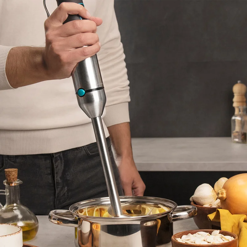 Блендер занурювальний CECOTEC Power TitanBlack 1500 XL TotalMix Завдяки повному набору аксесуарів ви зможете насолоджуватись незліченними рецептами за допомогою одного приладу. Приготуйте збиті вершки та безе за допомогою вінчика для збивання, повітряні тістечка за допомогою інноваційних вінчиків, гладке та вершкове пюре за допомогою пристосування для пюре, наріжте, подрібніть і змішайте всі види продуктів, створіть смачні вироби з фруктів та овочів з ексклюзивною насадкою. Приготуйте все, що тільки уявити з Power TitanBlack 1500 XL TotalMix. Леза максимальної твердості та гостроти. Інноваційна технологія CrossBlades з 4 лезами з титановим покриттям дозволяє миттєво отримати найкращі результати за рахунок збільшення твердості та часу заточування, дозволяючи подрібнювати навіть найтвердіші продукти, такі як лід. Подовжена ніжка XL. Power TitanBlack 1500 XL TotalMix має дуже довгу ніжку XL для більшої зручності та комфорту при повсякденному використанні, дозволяючи змішувати як у великих каструлях, так і у високих склянках. Регульована швидкість та функція Turbo. Power TitanBlack 1500 XL TotalMix має регульований перемикач швидкості та функцію Turbo, щоб з повною точністю адаптуватися до потреб будь-якого рецепту. Скористайтеся перевагами низьких швидкостей для більш м’яких продуктів або збивання яєць, а також високими швидкостями або функцією Turbo для збивання твердіших продуктів. Система Fix Plus. Система Fix Plus одним клацанням гарантує легке кріплення та від’єднання для більш швидкої установки аксесуарів. А коли все буде готове, помістіть аксесуари в посудомийну машину для зручнішого та безпроблемного очищення. Захист від бризок. Захист від бризок забезпечує чистіше використання за рахунок одночасного перемішування та подрібнення без забризкування робочої зони. Склянка на 800 мл з кришкою допоможе вам приготувати всі рецепти та зберігати їх у холодильнику. Максимальна продуктивність за 1500 вт. З Power TitanBlack 1500 XL TotalMix ви можете працювати з максимальними потребами завдяки його потужності 1500 Вт, отримуючи дрібні та однорідні суміші за лічені секунди та без зусиль. Ергономічний дизайн для використання без зношування. Ергономічний дизайн та кнопки полегшують тривале використання без зношування. Крім того, ручка має покриття Soft Touch з м’яким захопленням, яке ідеально адаптується до вашої руки, забезпечуючи більший контроль та комфорт.