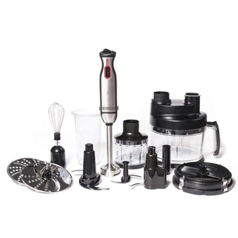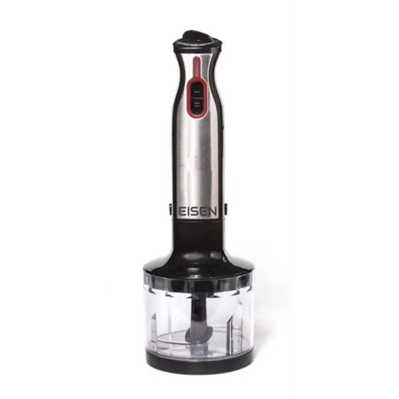 Блендерий набір EISEN EBSS-0110B – ваш незамінний та універсальний помічник на кухні. Змішуйте, збивайте та подрібнюйте інгредієнти до однорідного стану за лічені секунди. Модель володіє потужністю 1000 Вт, функцією захисту від перегріву та двома швидкісними режимами роботи: «Turbo» – режим максимальної потужності й основний, з плавним регулюванням швидкості. Укомплектований: великою чашею (2000 мл) та об’ємною чашею подрібнювача (400 мл), мірним стаканом з кришкою 600 мл, насадкою для дерунів і шинкування, а також, кубікорізкою (8х8 мм). Завдяки надійній конструкції та нескладному управлінню, пристрій з легкістю справляється з поставленими завданнями. Сучасний дизайн Корпус блендера EISEN EBSS-0110B виготовлений з якісного пластику, а вінчик для збивання й насадки – з нержавіючої сталі “Steel PRO”. Блендерний набір представлений у класичному чорному кольорі, має сучасний дизайн, що дозволяє органічно вписатися в будь-який кухонний інтер’єр. Різноманітність насадок Блендерний набір EISEN EBSS-0110B допоможе впоратися з безліччю кулінарних завдань при приготуванні страв у домашніх умовах. Комплект оснащений великою кількістю насадок, що спрощують роботу на кухні, а саме: -Вінчик для збивання: допоможе приготувати смачний крем, фруктове пюре, дитяче харчування або ніжне смузі -Диск-терка для дерунів: дозволить без зайвих зусиль натерти велику кількість картоплі для страви -Диск для шинкування та крупної нарізки: без нього не обійтися, коли потрібно швидко нарізати велику кількість продуктів -Kubixx (кубікорізка 8х8 мм): саме ця насадка незамінна при приготуванні смачних і корисних салатів -Крюк для замісу тіста: стане надійним помічником у приготуванні пишного тіста для будь-якої випічки -Міні подрібнювач: перемелює спеції, зелень і навіть кавові зерна, а також, більш тверді інгредієнти -Велика чаша (місткість 2л) та ніж для подрібнення: допоможе подрібнити об’ємні продукти у великій кількості -Мірний стакан з кришкою: щільно прилегла кришка на мірному стакані сприяє більш тривалому зберіганню продуктів у холодильнику Покриття Soft-touch Ручка блендера зручно та надійно розміщується в руці, завдяки своїй ергономічній формі й особливому покриттю Soft-touch. Пристрій не ковзає при використанні, тому керувати ним тривалий час зовсім нескладно. Комфорт і безпека Модель EISEN EBSS-0110B працює від мережі 220 В, довжини шнура в 95 см цілком достатньо для комфортної експлуатації. Безпечну та ефективну роботу пристрою забезпечує механізм захисту від перегріву, завдяки якому прилад не перегрівається. Зручна експлуатація Блендерний набір виготовлений з міцного пластику, з елементами зі нержавіючої сталі. Всі робочі деталі легко розбираються та піддаються очищенню. Чаші блендера, насадка та вінчик миються під проточною водою або в посудомийній машині. Корпус можна протирати вологою серветкою або мочалкою. Невелика вага та компактні габарити EISEN EBSS-0110B забезпечують зручне зберігання й приємне користування.
