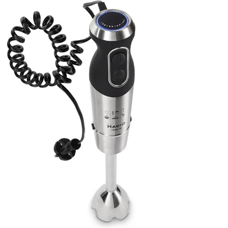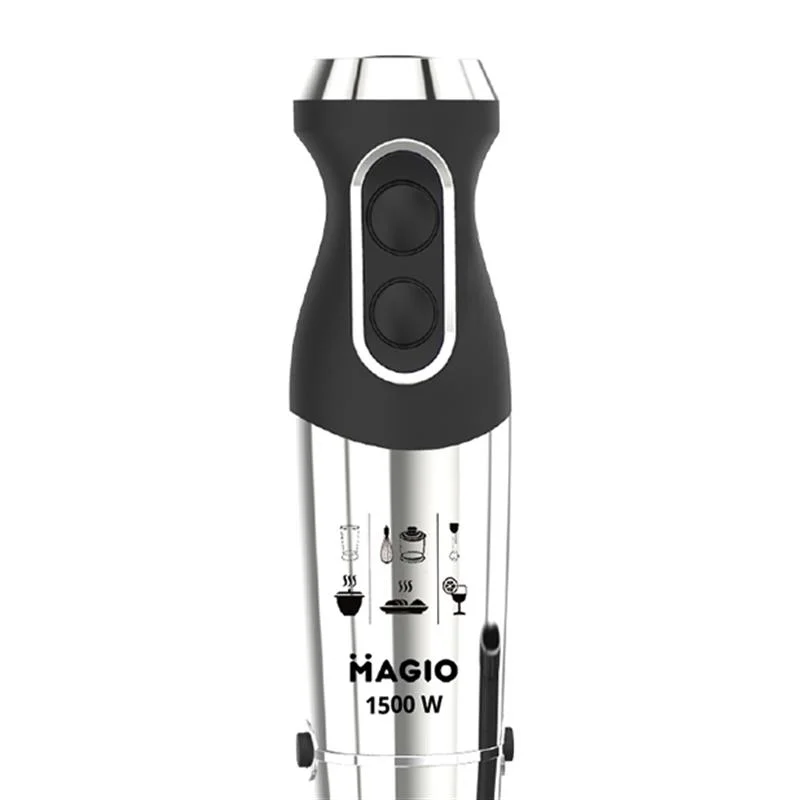 Блендерний набір MG-642 дозволить вам урізноманітнити ваше меню і приготувати новий кулінарний шедевр. Потужність блендера становить 1500 Вт, що забезпечує безшумну ефективну роботу протягом тривалого часу. Погружна частина виконана з нержавіючої сталі, а ніж з титановим покриттям - запорука стійкості до зношування і довговічності. Ергономічна рукоятка з приємним покриттям SOFT TOUCH. Блендер може працювати на 13 плавно перемикаючих швидкостях. Перемикач знаходиться на рукоятці приладу, що дуже зручно. У комплект входить пластиковий мірний стакан, вінчик для збивання і міні-комбайн з покриттям SOFT TOUCH з 3 насадками - обсяг 1250 мл. Насадки: нарізка, шинкування і терка. Ці властивості в поєднанні з компактним дизайном роблять блендер незамінним помічником на вашій кухні.