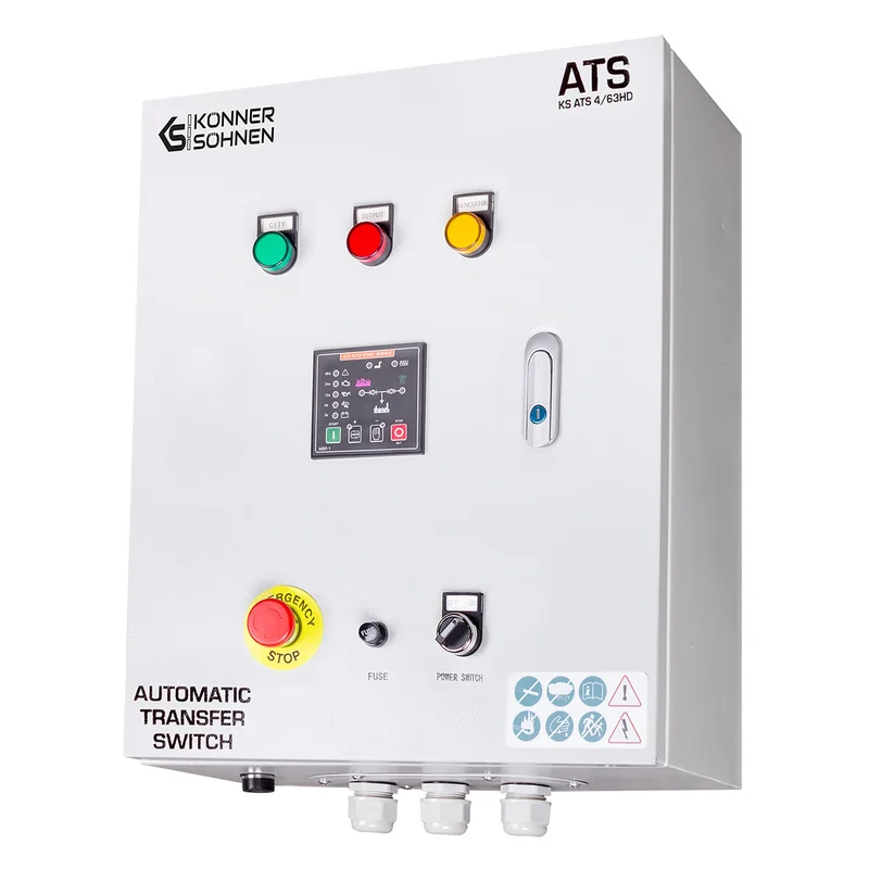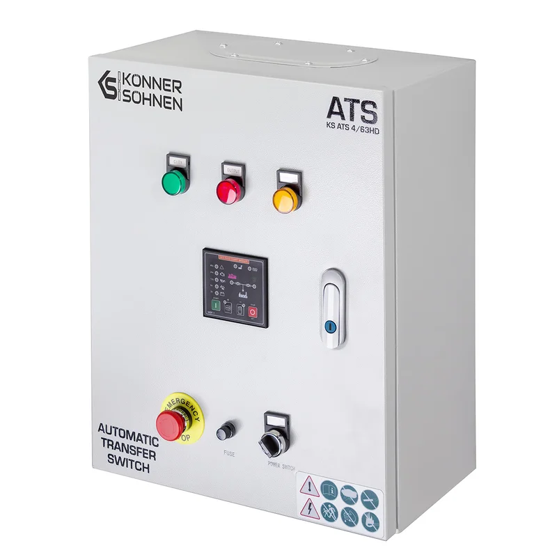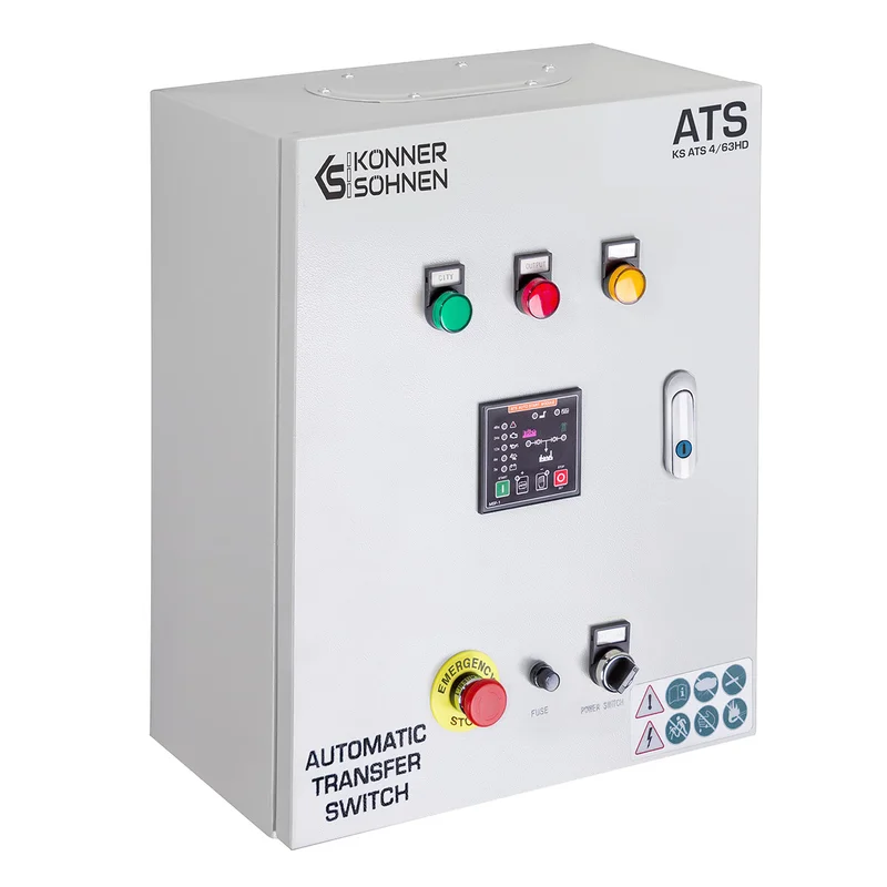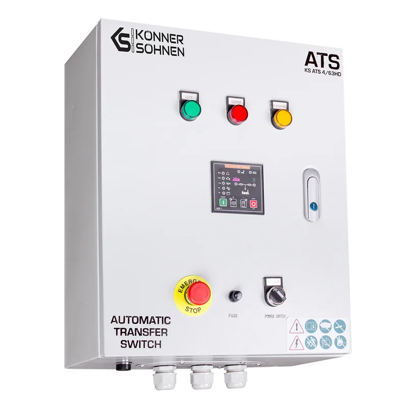Блок автоматичного введення резерву (AВР) KS ATS 4/63HD німецької торгової марки Könner & Söhnen автоматично запускає генератор і перемикає навантаження на нього при відключенні основного джерела живлення, та автоматично зупиняє роботу генератора при відновленні центрального електропостачання. Підходить для дизельних генераторів, що оснащені універсальним 6-піновим роз’ємом для підключення блоку автоматичного введення резерву (вхід для АВР). Блок АВР має контролер, який дозволяє програмувати час перед автоматичним запуском генератора у випадку відключення електроенергії, час прогріву генератора перед підключенням навантаження та сигналізує про виявленні помилки. Має кнопку аварійної зупинки генератора. Блок АВР може працювати як в автоматичному так і в ручному режимі.