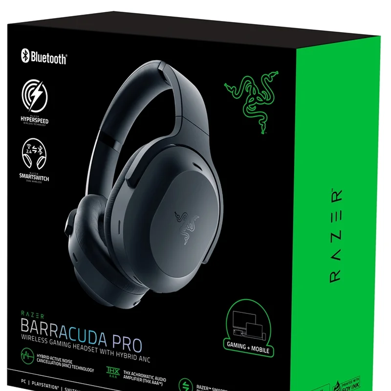 Грайте всюди Бездротова мультиплатформна ігрова та мобільна гарнітура Неважливо, де ви знаходитесь – у приміщенні або на відкритому повітрі, – бездротова мультиплатформна ігрова та мобільна гарнітура Razer Barracuda однаково добре працює скрізь. Можливість інтелектуального перемикання гарнітури між високошвидкісним з'єднанням на частоті 2.4 ГГц та режимом Bluetooth дозволить вам насолоджуватися безперервним звучанням навушників та високою якістю голосу, що захоплюється мікрофоном з шумопоглинанням. Перемикач режиму бездротової роботи Razer Smartswitch для швидкого переходу між режимами Razer HyperSpeed Wireless та Bluetooth Для більшої зручності гарнітура може миттєво перемикатися між високошвидкісним з'єднанням на частоті 2,4 ГГц та режимом Bluetooth, щоб без перерв продовжувати відтворення, коли ви змінюєте джерело аудіосигналу між комп'ютером/консоллю та телефоном. Вбудовані спрямовані мікрофони з шумозаглушенням для кришталево чіткої передачі голосу Два приховані мікрофони забезпечують потужне шумозаглушення, рівень якого можна настроювати для використання в приміщеннях або на відкритому повітрі, щоб гарантувати, що вас завжди буде чути. Випромінювачі Razer Triforce Titanium діаметром 50 мм Для високої якості звуку Наша запатентована конструкція випромінювача з трьох компонентів відтворює виключно чіткі високі, середні та низькі частоти, забезпечуючи глибше занурення в гру та динамічніше прослуховування музики та відео. Надм'які амбушюри з піноматеріалу flowknit з ефектом пам'яті для легкості та зручності використання протягом усього дня Дихаюча ткана поверхня перешкоджає нагріванню, а надм'який піноматеріал з ефектом пам'яті забезпечує комфортне використання гарнітури протягом усього дня як у приміщенні, так і на відкритому повітрі. Додаток Razer audio для зручного налаштування параметрів Налаштуйте гарнітуру, регулюючи рівень шумозаглушення мікрофонів, параметри еквалайзера, а також налаштовуючи функцію автоматичного вимкнення та багато іншого. 40 годин роботи від батареї та заряджання через USB-C щоб грати без зупинки та користуватися щодня Тривалість роботи Razer Barracuda відповідає її універсальності: заряду акумулятора вистачить більш ніж на день гри та прослуховування в дорозі.