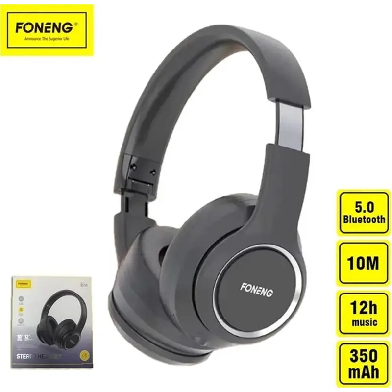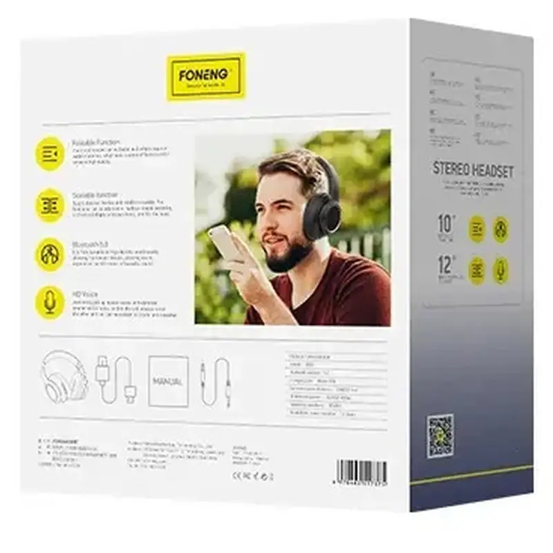 FONENG Headset – бездротові навушники на оголов’ї. Керуйте плеєром, листіть треки вперед/назад, збільшуйте/зменшуйте гучність, ставте музику на паузу безпосередньо з навушників. Дуже м’які та комфортні амбушури. Підключаються як бездротовим способом, так і за допомогою аудіокабелю. Заряджаються стандартним дротом type-C. Є регулювання об’єму для комфортної посадки на голову. Навушники складаються усередину для зручності зберігання та транспортування.