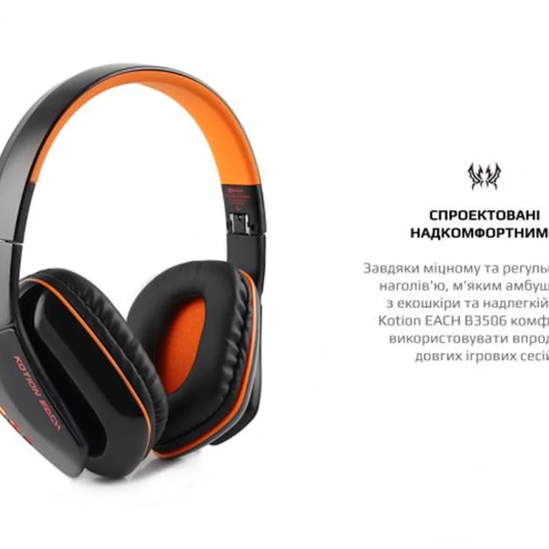 Головні переваги: працюють через провід 3,5 і по bluetooth Завдяки телескопічній металевій дузі, наголов’я міцне та легко регулюється. Амбушури покриті зручною і м’якою екошкірою. На правому навушнику розташована панель управління, за допомогою якої ви зможете регулювати гучність, відповідати на дзвінки та перегортати треки. Всеспрямований мікрофон ергономічно вмонтований в правий навушник завдяки енергоємній батареї, ви можете насолоджуватися якісним звучанням протягом 10 годин Переваги: Мультиплатформна гарнітура Під’єднання 4-полюсного 3.5-мм роз’єму для гарнітури сумісний з PS4/XBOX ONE (версія 2015)/Nintendo Switch/VR/ноутбуків/мобільних пристроїв. Швидкий контроль Для зручного управління гарнітурою Kotion EACH B3506 на правому навушнику розміщені кнопки управління гучністю, перемикання треків, клавіша включення/виключення, відповідь на дзвінок, паузи/відтворення. Спроектовані надкомфортними Kotion EACH B3506 — це легка гарнітура, обладнана міцним і регульованим наголов’ям, а також м’якими амбушурами з екошкіри, що дає змогу з задоволенням використовувати їх упродовж довгих ігрових сесій. А завдяки можливості складатись, їх легко транспортувати в будь якій сумці. Універсальні у використанні Навушники можуть працювати через провід 3,5 і по bluetooth, що робить їх універсальним аксесуаром Енергоємнісна батарея енергоємною батареї в 400 мАг, ви зможете насолоджуватися їх якісним звучання протягом 10 годин.